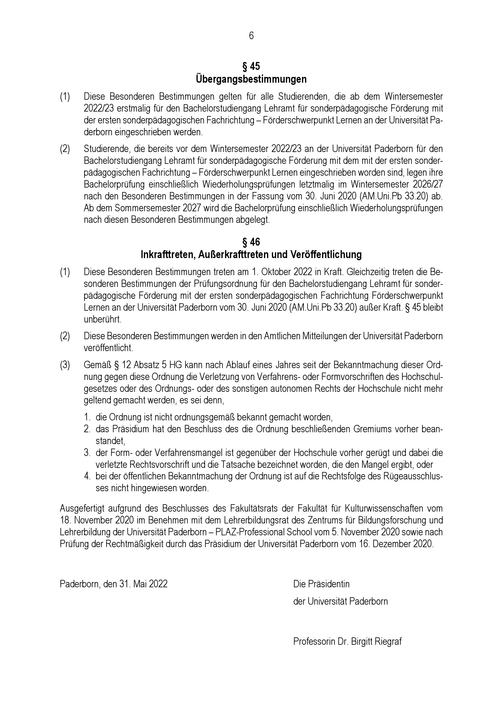 Besondere Bestimmungen der Prüfungsordnung für den Bachelorstudiengang Lehramt für sonderpädagogische Förderung mit der ersten sonderpädagogischen Fachrichtung Förderschwerpunkt Lernen an der Universität Paderborn : vom 31. Mai 2022