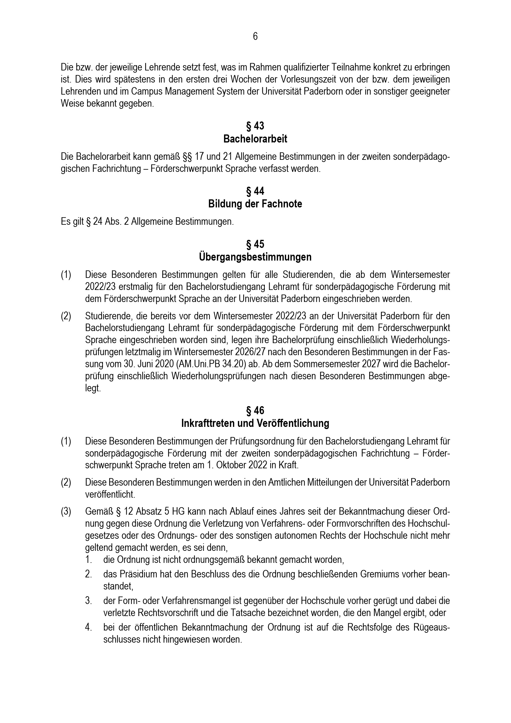 Besondere Bestimmungen der Prüfungsordnung für den Bachelorstudiengang Lehramt für sonderpädagogische Förderung mit der zweiten sonderpädagogischen Fachrichtung Förderschwerpunkt Sprache an der Universität Paderborn : vom 31. Mai 2022