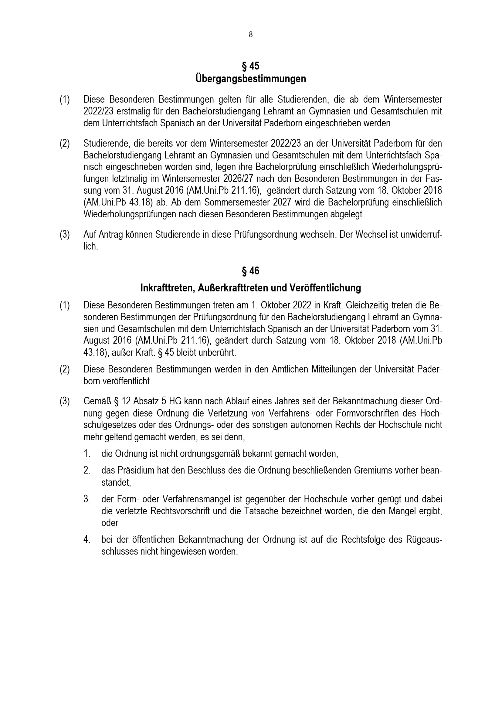 Besondere Bestimmungen der Prüfungsordnung für den Bachelorstudiengang Lehramt an Gymnasien und Gesamtschulen mit dem Unterrichtsfach Spanisch an der Universität Paderborn : vom 31. Mai 2022