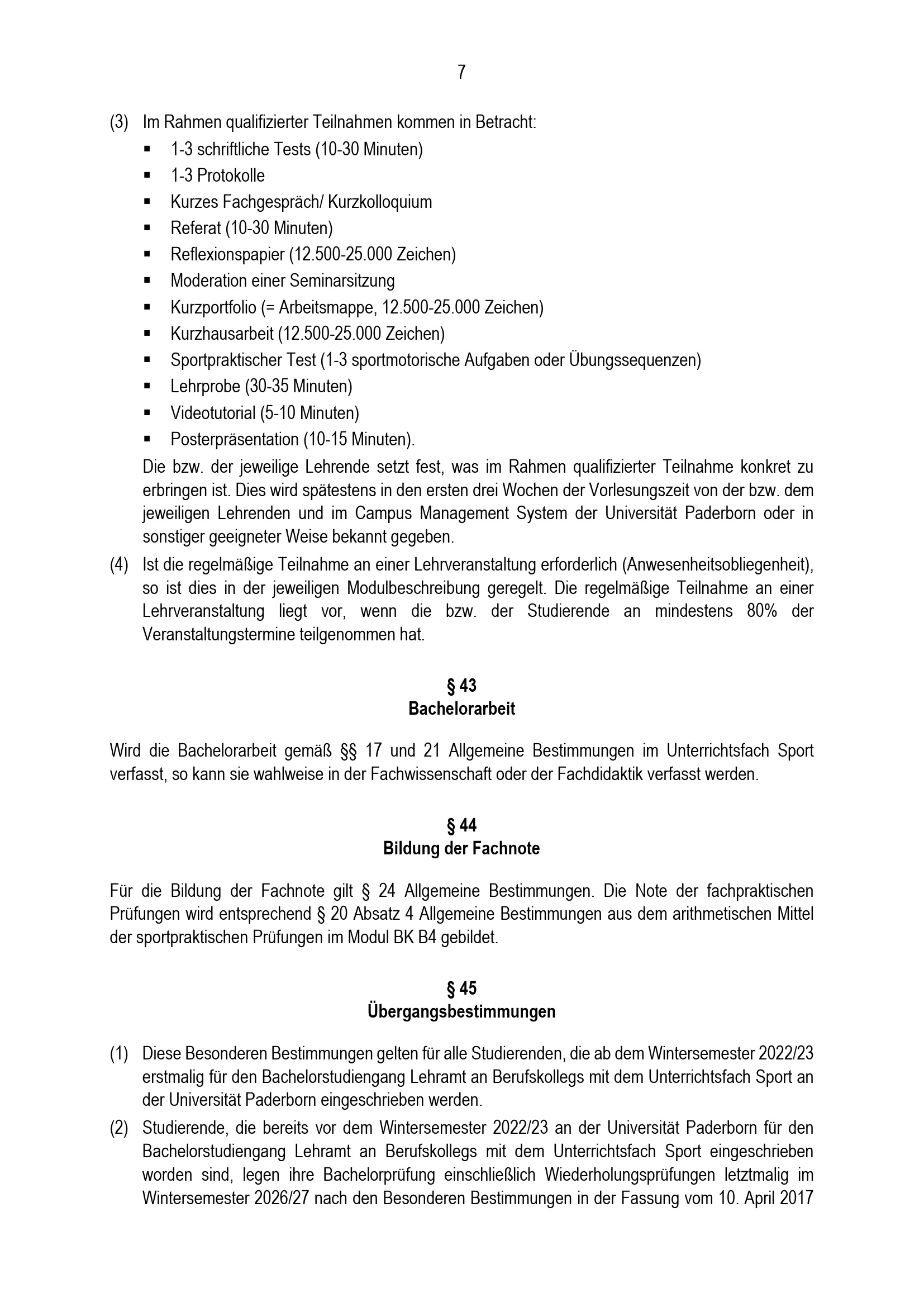 Besondere Bestimmungen der Prüfungsordnung für den Bachelorstudiengang Lehramt an Berufskollegs mit dem Unterrichtsfach Sport an der Universität Paderborn : vom 31. Mai 2022