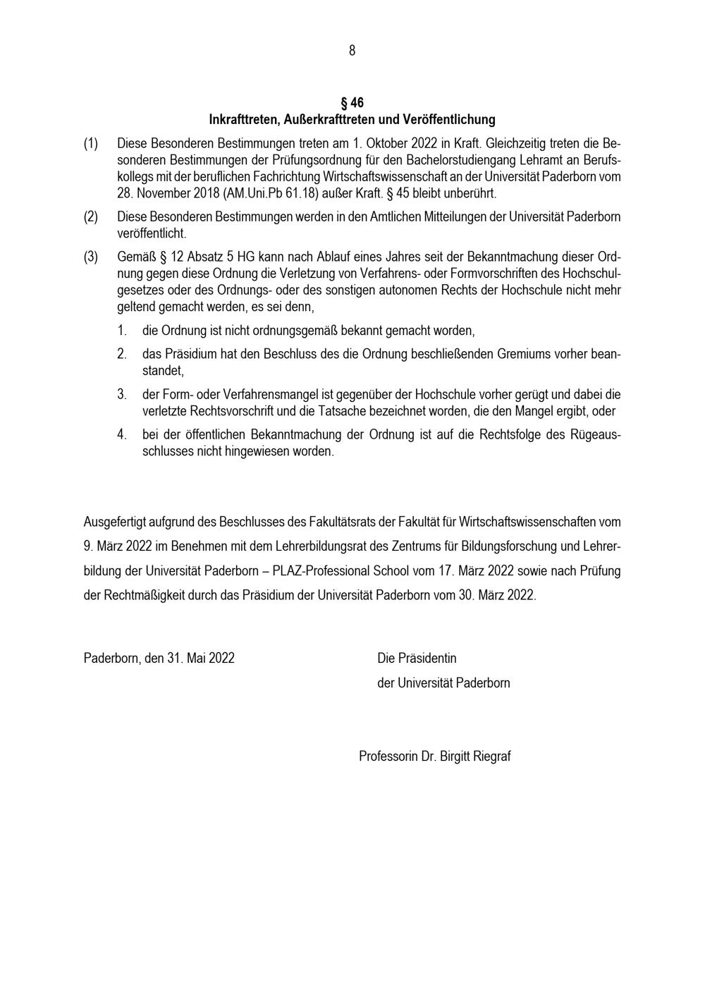 Besondere Bestimmungen der Prüfungsordnung für den Bachelorstudiengang Lehramt an Berufskollegs mit der beruflichen Fachrichtung Wirtschaftswissenschaft an der Universität Paderborn : vom 31. Mai 2022