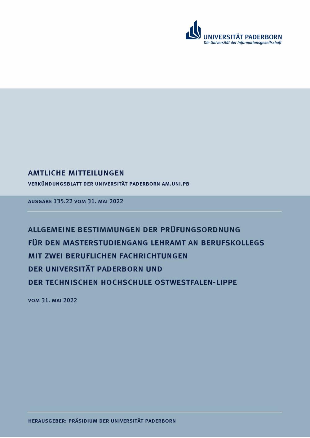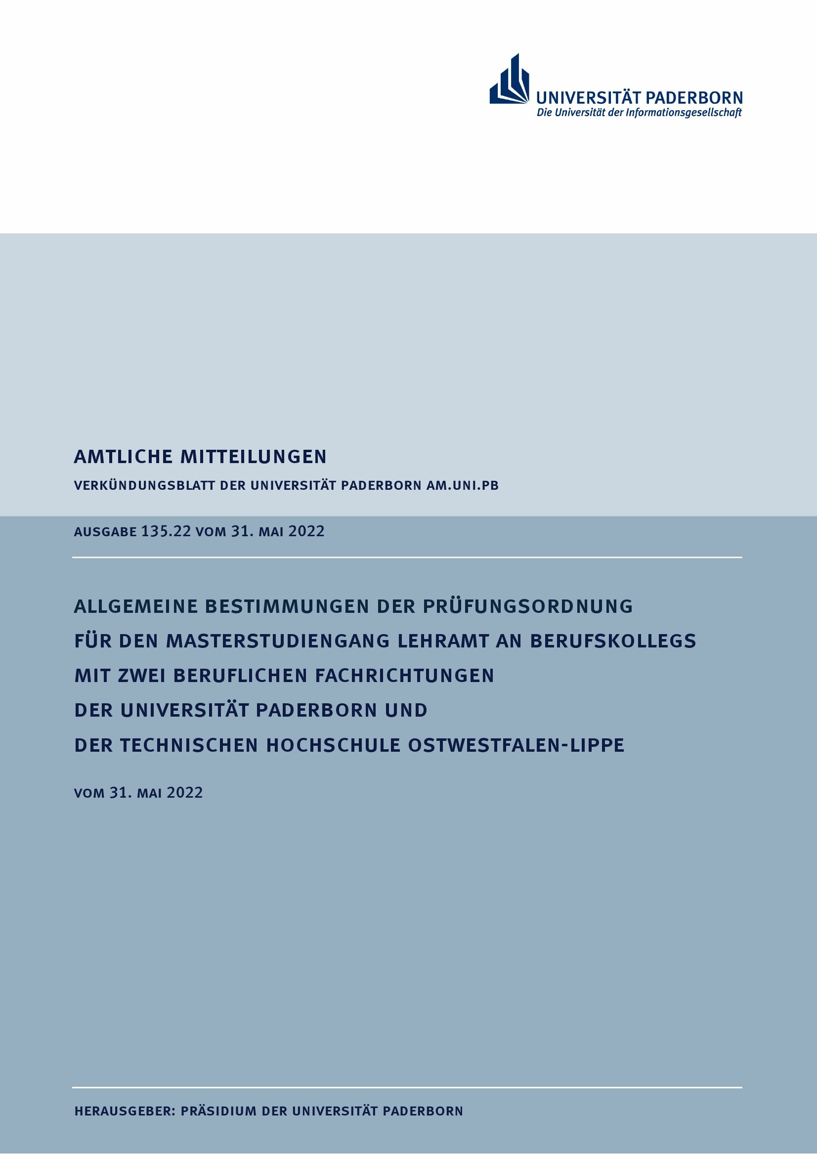 Allgemeine Bestimmungen der Prüfungsordnung für den Masterstudiengang Lehramt an Berufskollegs mit zwei beruflichen Fachrichtungen an der Universität Paderborn und der Technischen Hochschule Ostwestfalen-Lippe : vom 31. Mai 2022