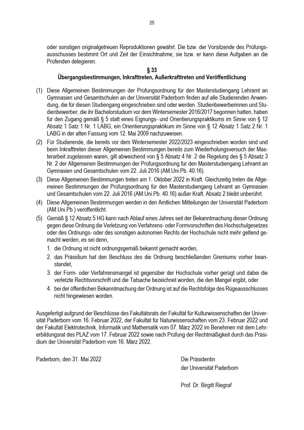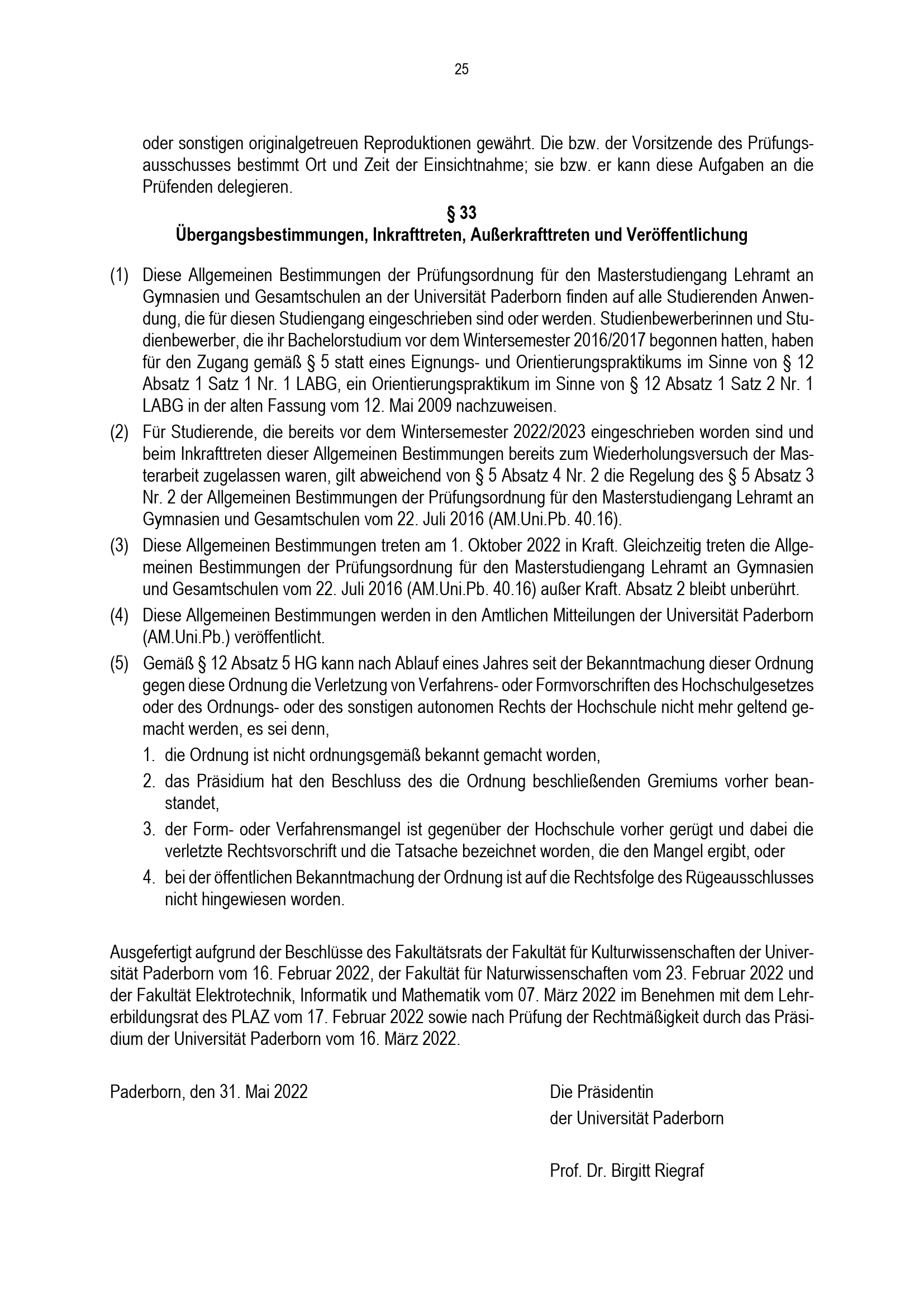 Allgemeine Bestimmungen der Prüfungsordnung für den Masterstudiengang Lehramt an Gymnasien und Gesamtschulen an der Universität Paderborn : vom 31. Mai 2022
