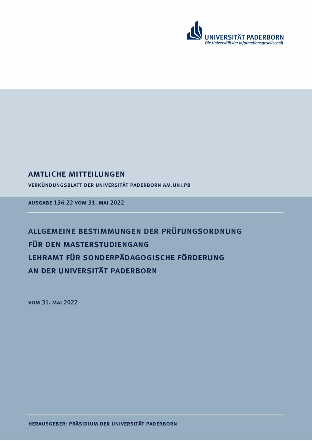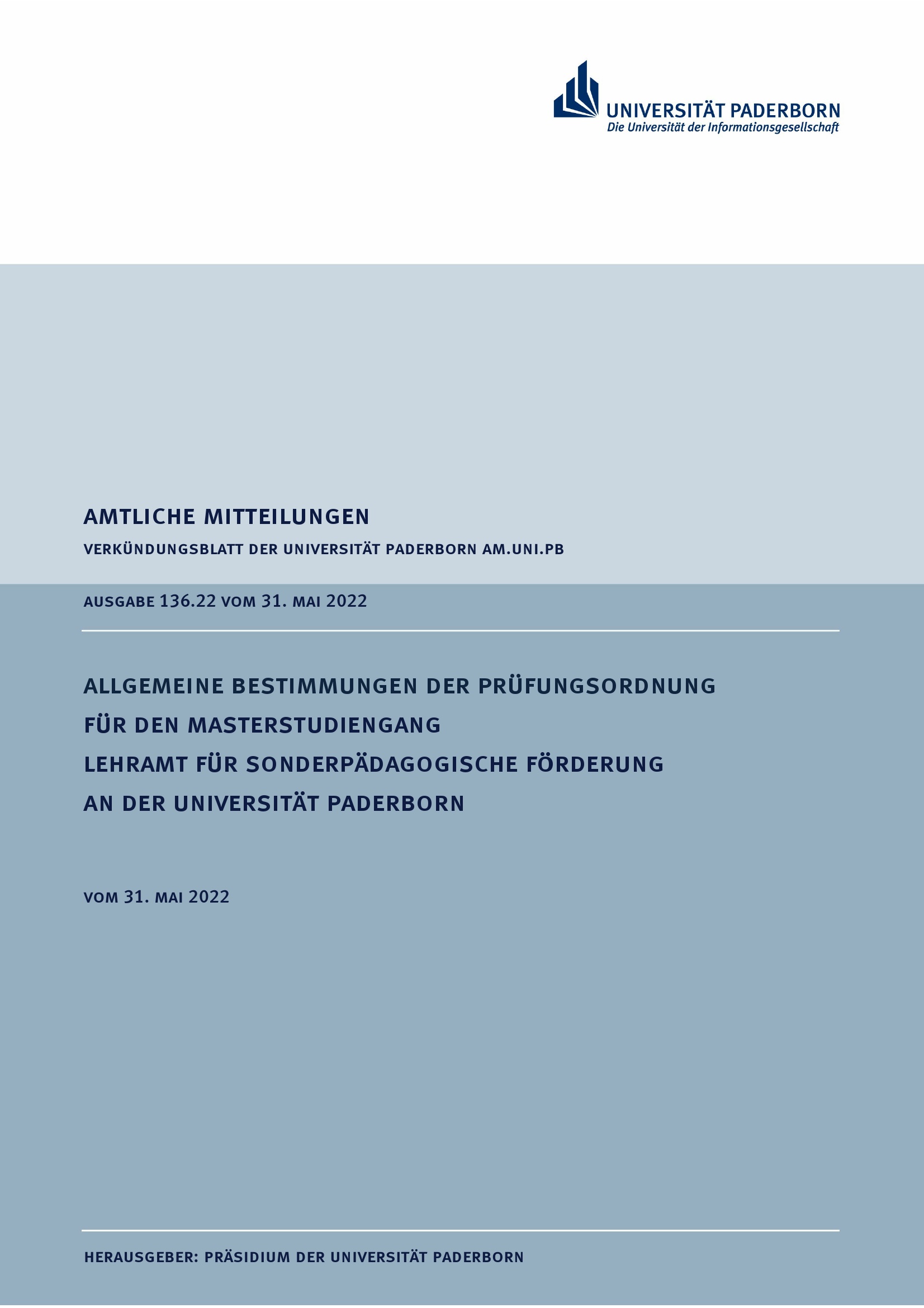 Allgemeine Bestimmungen der Prüfungsordnung für den Masterstudiengang Lehramt für sonderpädagogische Förderung an der Universität Paderborn : vom 31. Mai 2022