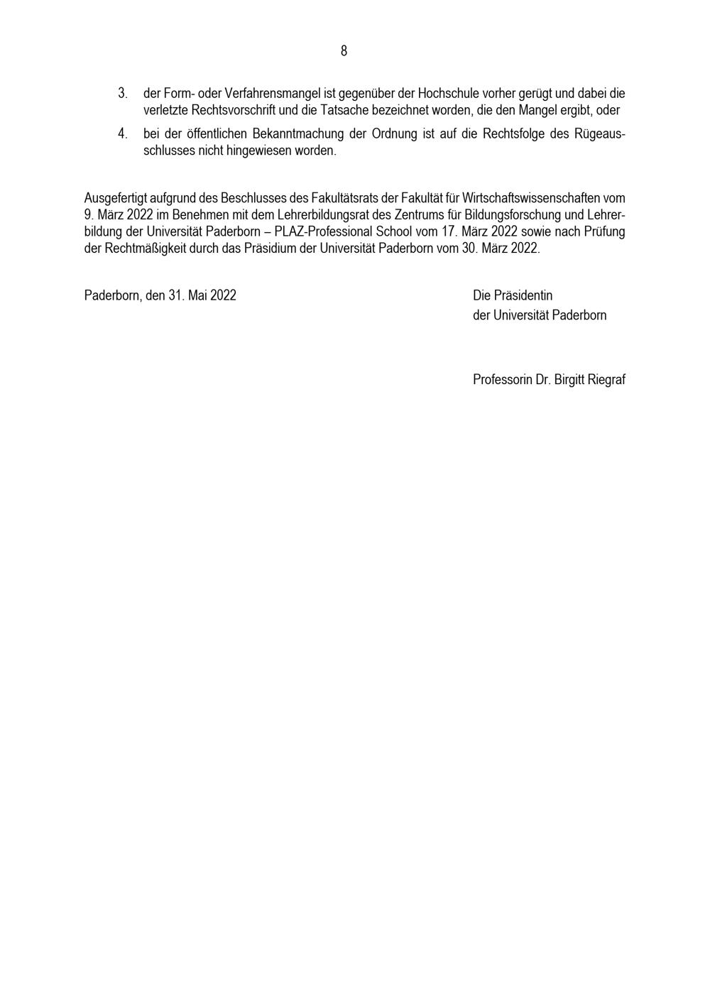 Besondere Bestimmungen der Prüfungsordnung für den Bachelorstudiengang Lehramt an Gymnasien und Gesamtschulen mit dem Erweiterungsfach Wirtschaft an der Universität Paderborn : vom 31. Mai 2022