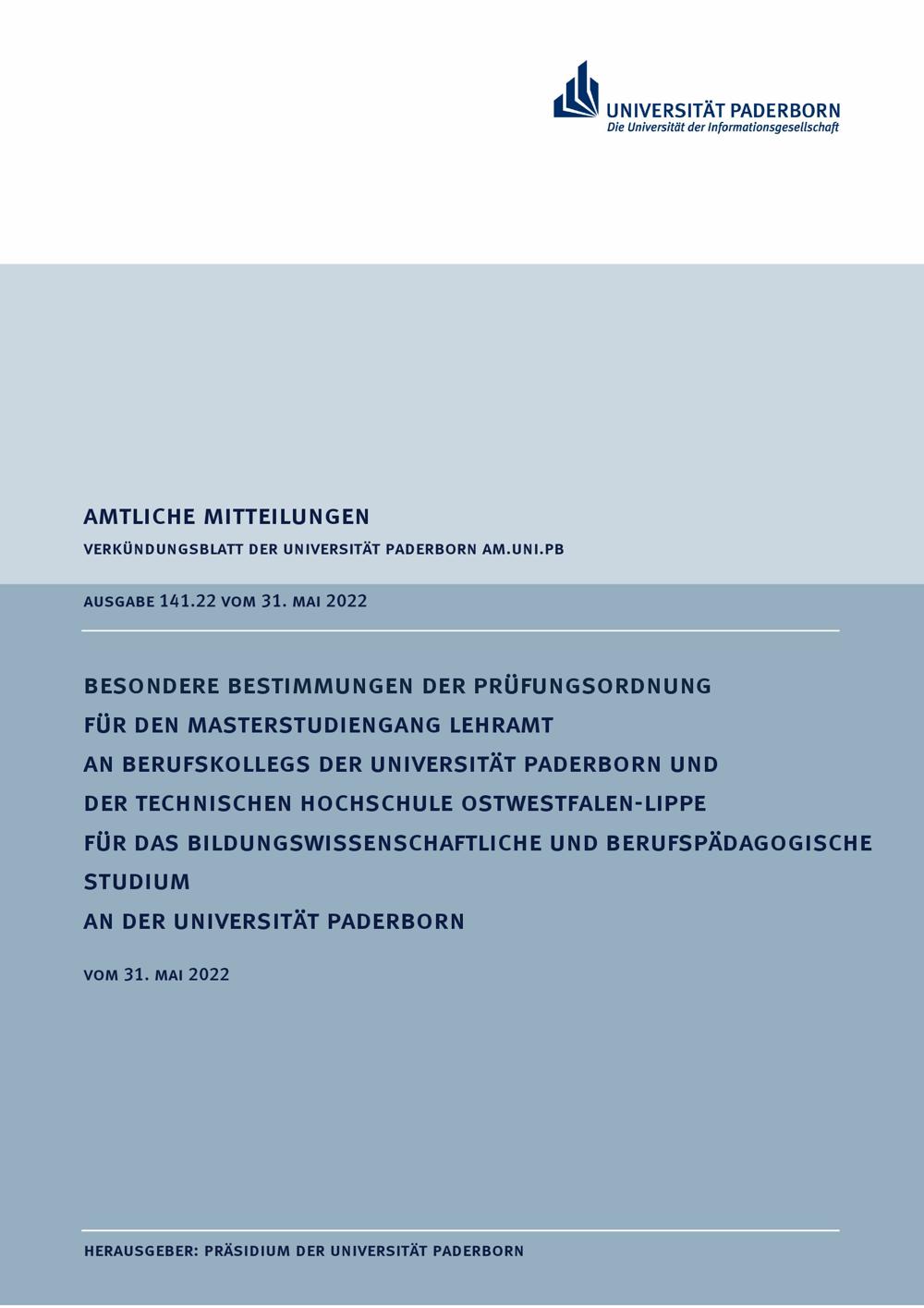 Besondere Bestimmungen der Prüfungsordnung für den Masterstudiengang Lehramt an Berufs-kollegs der Universität Paderborn und der Technischen Hochschule Ostwestfalen-Lippe für das bildungswissenschaftliche und berufspädagogische Studium an der Universität Paderborn : vom 31. Mai 2022