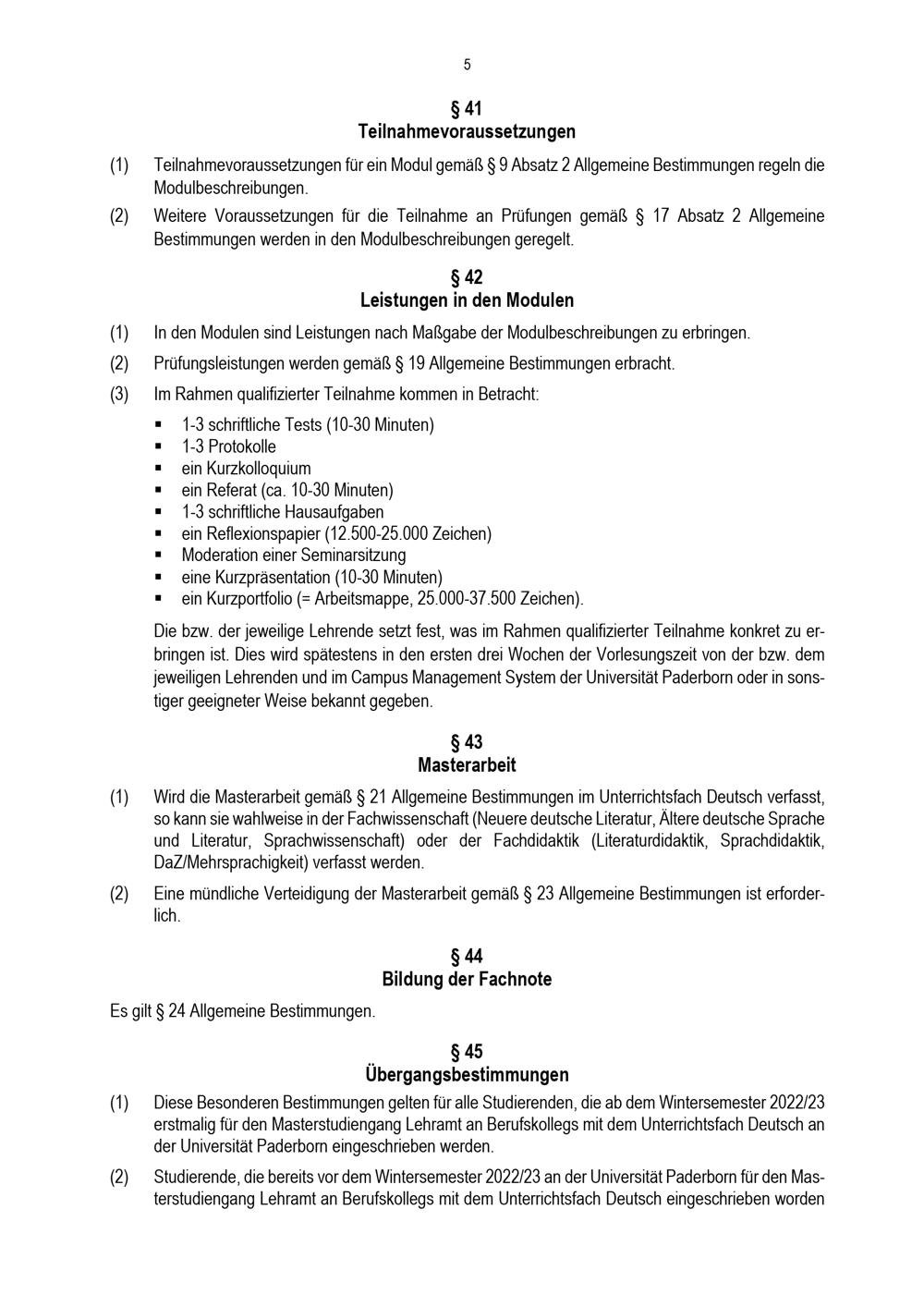 Besondere Bestimmungen der Prüfungsordnung für den Masterstudiengang Lehramt an Berufskollegs mit dem Unterrichtsfach Deutsch an der Universität Paderborn : vom 31. Mai 2022