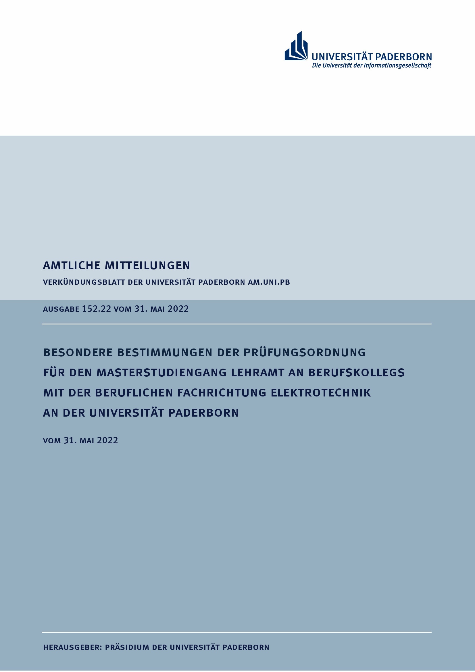 Besondere Bestimmungen der Prüfungsordnung für den Masterstudiengang Lehramt an Berufskollegs mit der beruflichen Fachrichtung Elektrotechnik an der Universität Paderborn : vom 31. Mai 2022