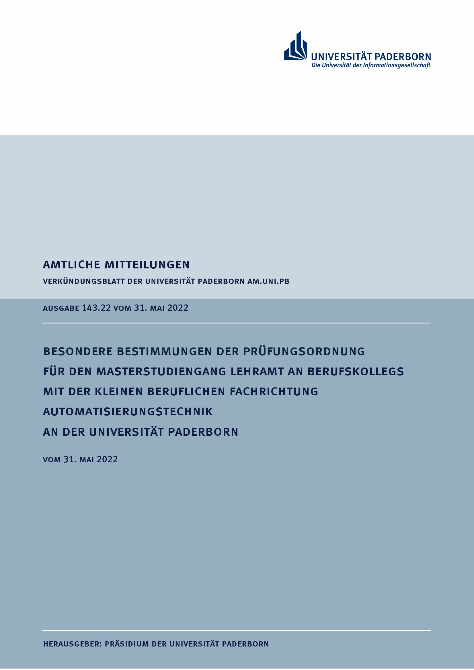 Besondere Bestimmungen der Prüfungsordnung für den Masterstudiengang Lehramt an Berufskollegs mit der Kleinen beruflichen Fachrichtung Automatisierungstechnik an der Universität Paderborn : vom 31. Mai 2022