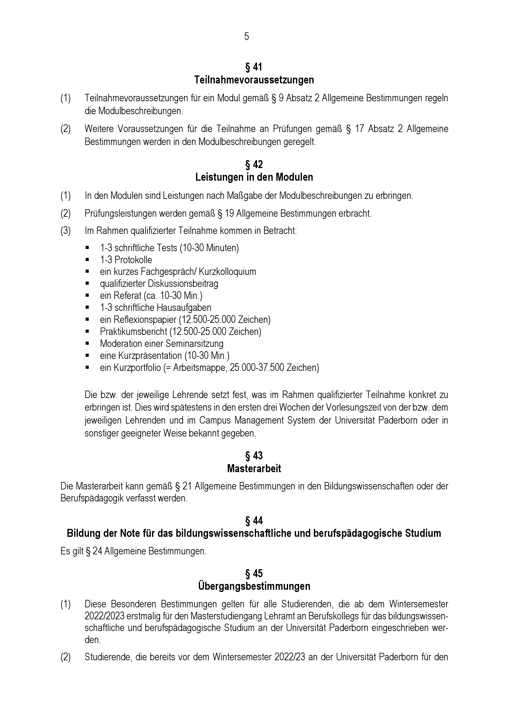 Besondere Bestimmungen der Prüfungsordnung für den Masterstudiengang Lehramt an Berufskollegs mit einer beruflichen Fachrichtung und einem Unterrichtsfach, mit zwei beruflichen Fachrichtungen, mit zwei Unterrichtsfächern oder mit einer Großen beruflichen Fachrichtung und einer Kleinen beruflichen Fachrichtung für das bildungswissenschaftliche und berufspädagogische Studium an der Universität Paderborn : vom 31. Mai 2022