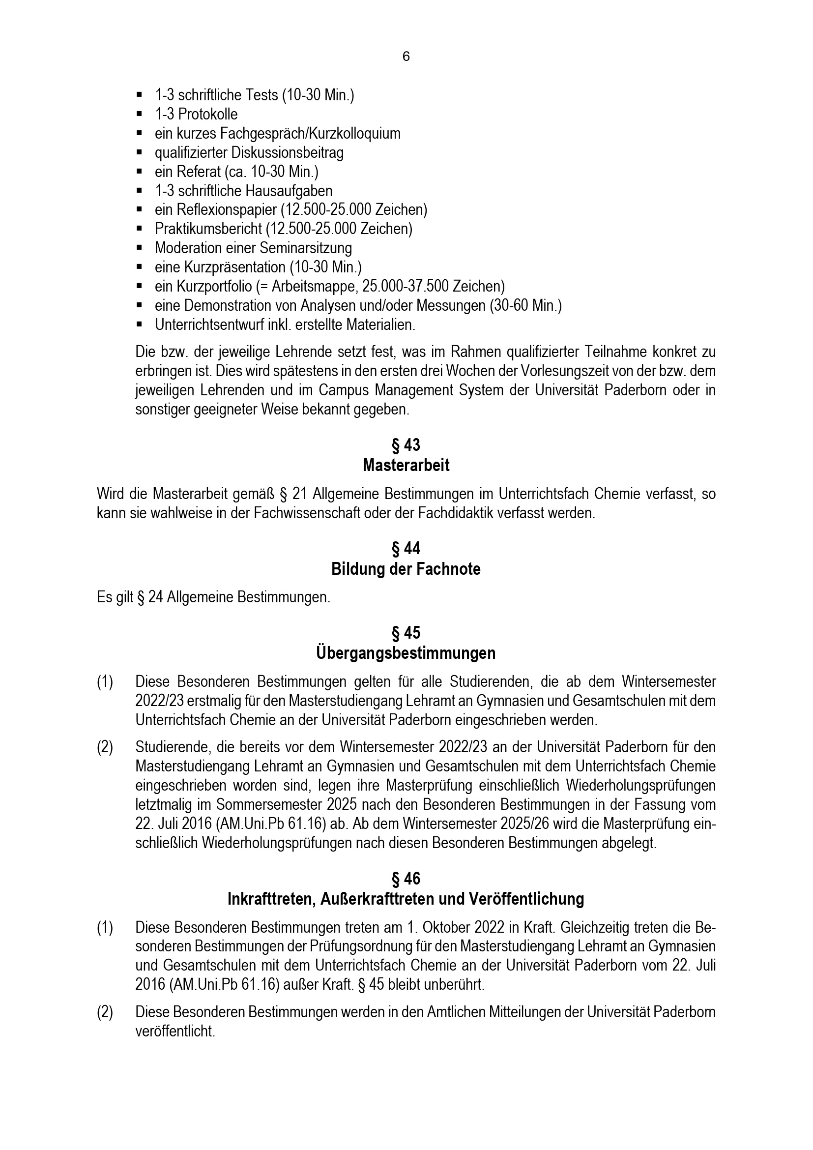 Besondere Bestimmungen der Prüfungsordnung für den Masterstudiengang Lehramt an Gymnasien und Gesamtschulen mit dem Unterrichtsfach Chemie an der Universität Paderborn : vom 31. Mai 2022