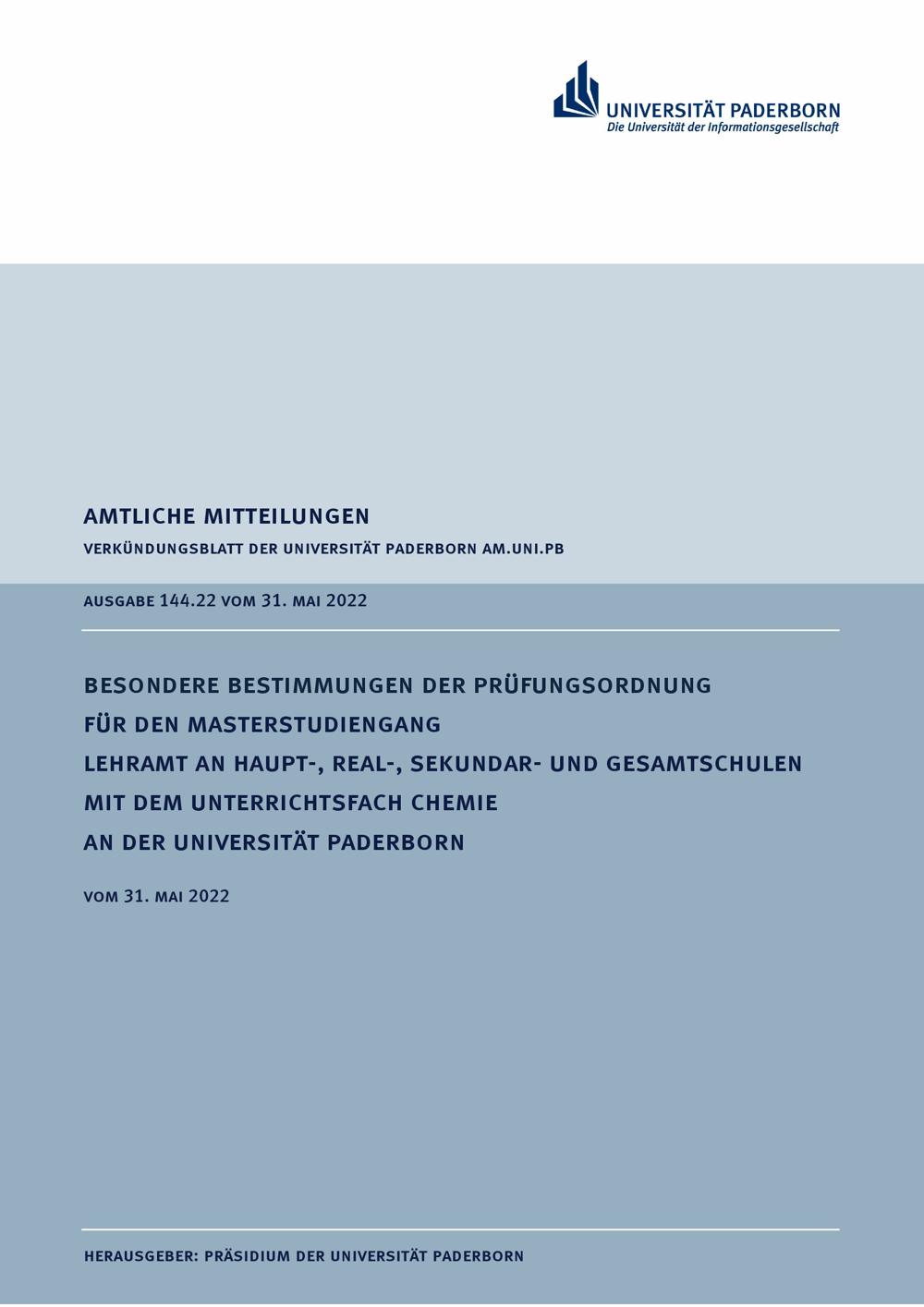 Besondere Bestimmungen der Prüfungsordnung für den Masterstudiengang Lehramt an Haupt-, Real-, Sekundar- und Gesamtschulen mit dem Unterrichtsfach Chemie an der Universität Paderborn : vom 31. Mai 2022
