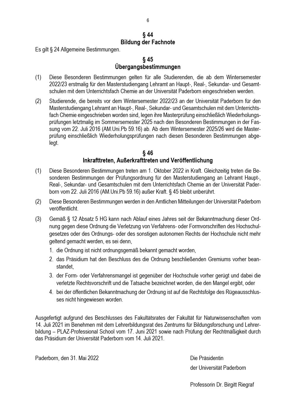 Besondere Bestimmungen der Prüfungsordnung für den Masterstudiengang Lehramt an Haupt-, Real-, Sekundar- und Gesamtschulen mit dem Unterrichtsfach Chemie an der Universität Paderborn : vom 31. Mai 2022
