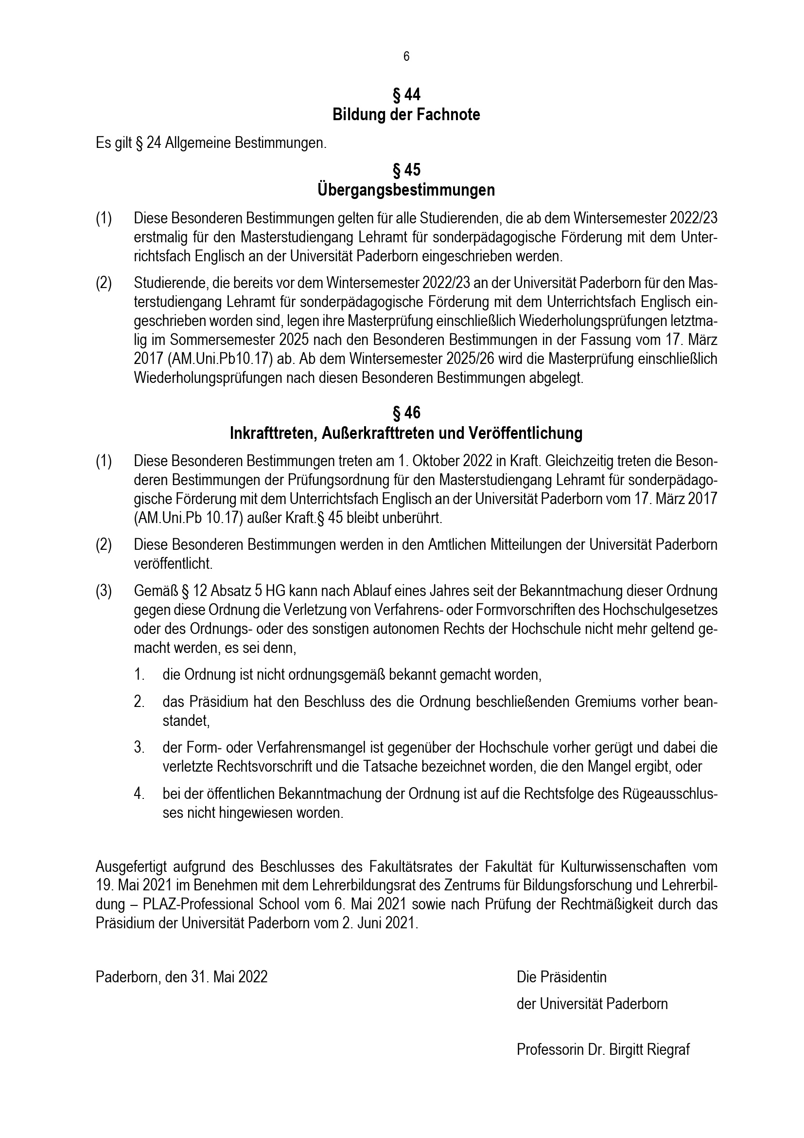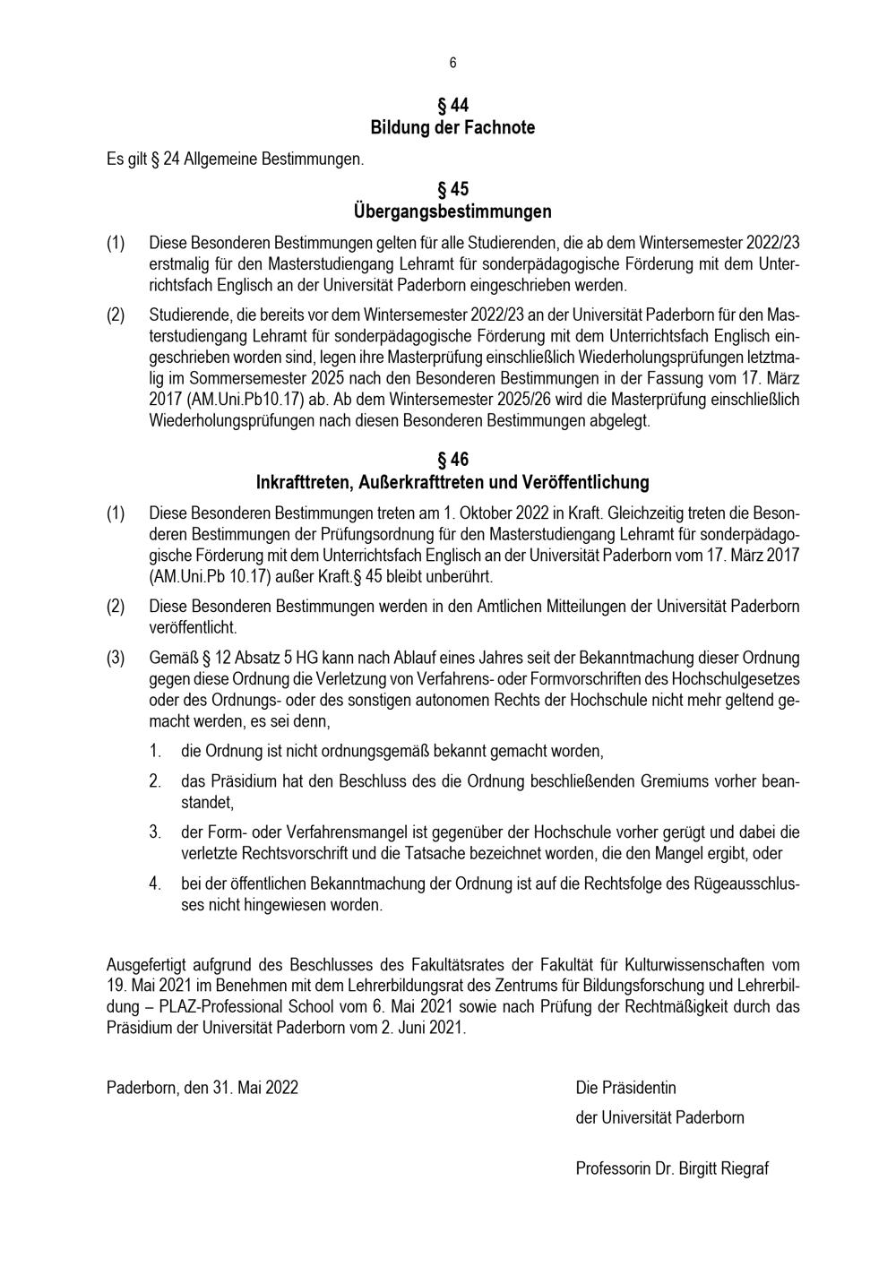 Besondere Bestimmungen der Prüfungsordnung für den Masterstudiengang Lehramt für sonderpädagogische Förderung mit dem Unterrichtsfach Englisch an der Universität Paderborn : vom 31. Mai 2022