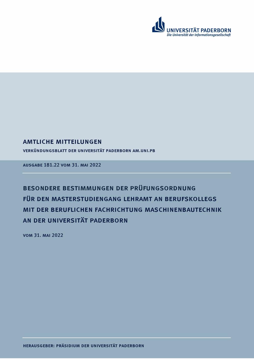 Besondere Bestimmungen der Prüfungsordnung für den Masterstudiengang Lehramt an Berufskollegs mit der beruflichen Fachrichtung Maschinenbautechnik an der Universität Paderborn : vom 31. Mai 2022