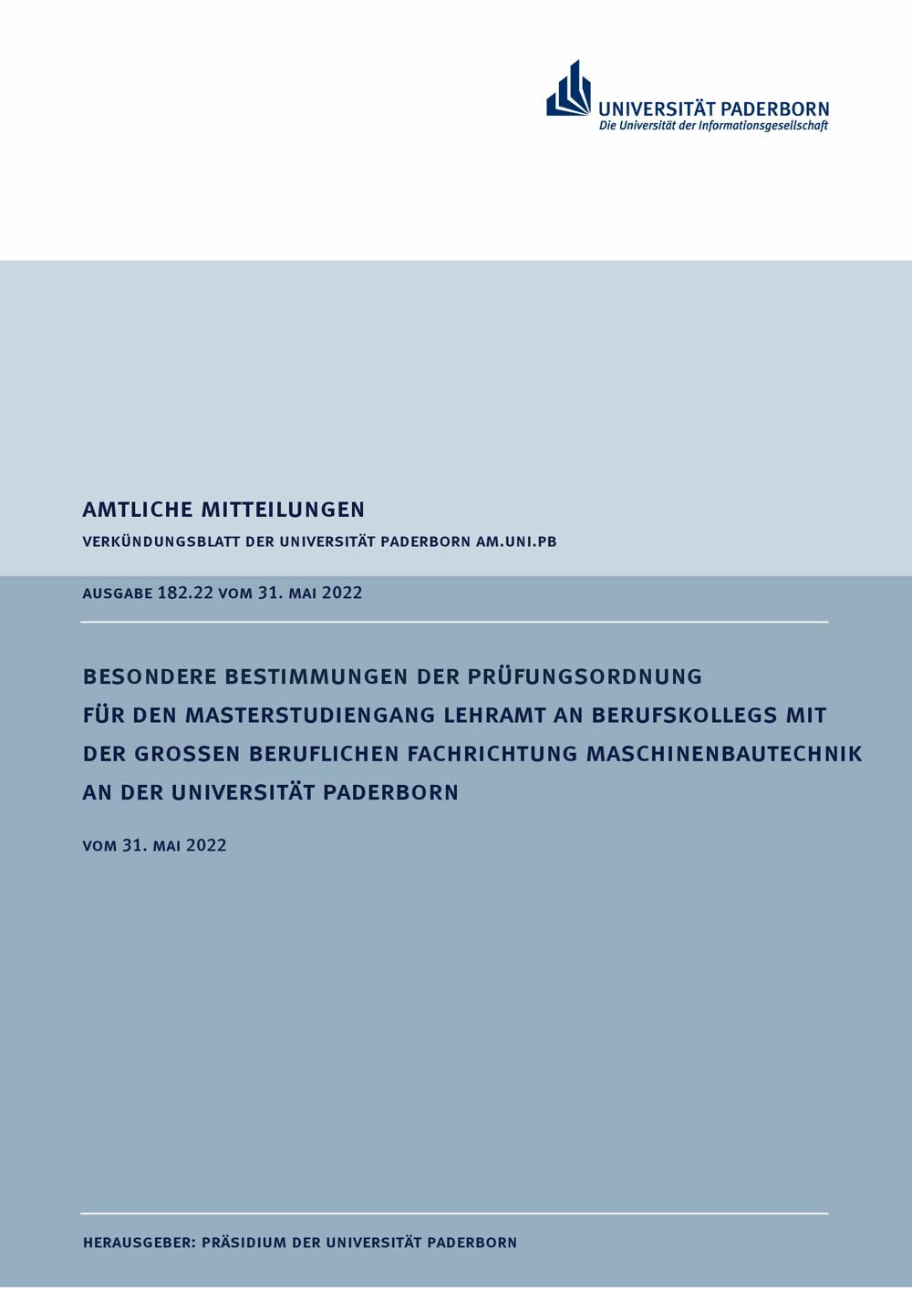 Besondere Bestimmungen der Prüfungsordnung für den Masterstudiengang Lehramt an Berufskollegs mit der Großen beruflichen Fachrichtung Maschinenbautechnik an der Universität Paderborn : vom 31. Mai 2022