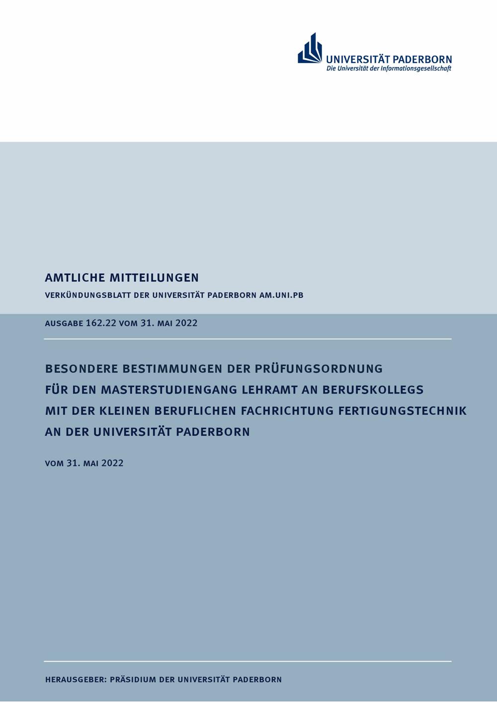 Besondere Bestimmungen der Prüfungsordnung für den Masterstudiengang Lehramt an Berufskollegs mit der Kleinen beruflichen Fachrichtung Fertigungstechnik an der Universität Paderborn : vom 31. Mai 2022