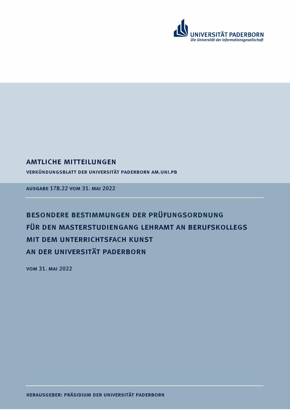 Besondere Bestimmungen der Prüfungsordnung für den Masterstudiengang Lehramt an Berufskollegs mit dem Unterrichtsfach Kunst an der Universität Paderborn : vom 31. Mai 2022