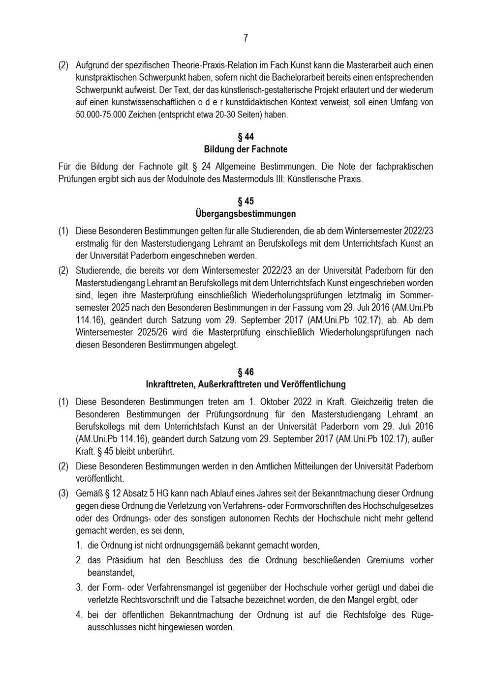 Besondere Bestimmungen der Prüfungsordnung für den Masterstudiengang Lehramt an Berufskollegs mit dem Unterrichtsfach Kunst an der Universität Paderborn : vom 31. Mai 2022