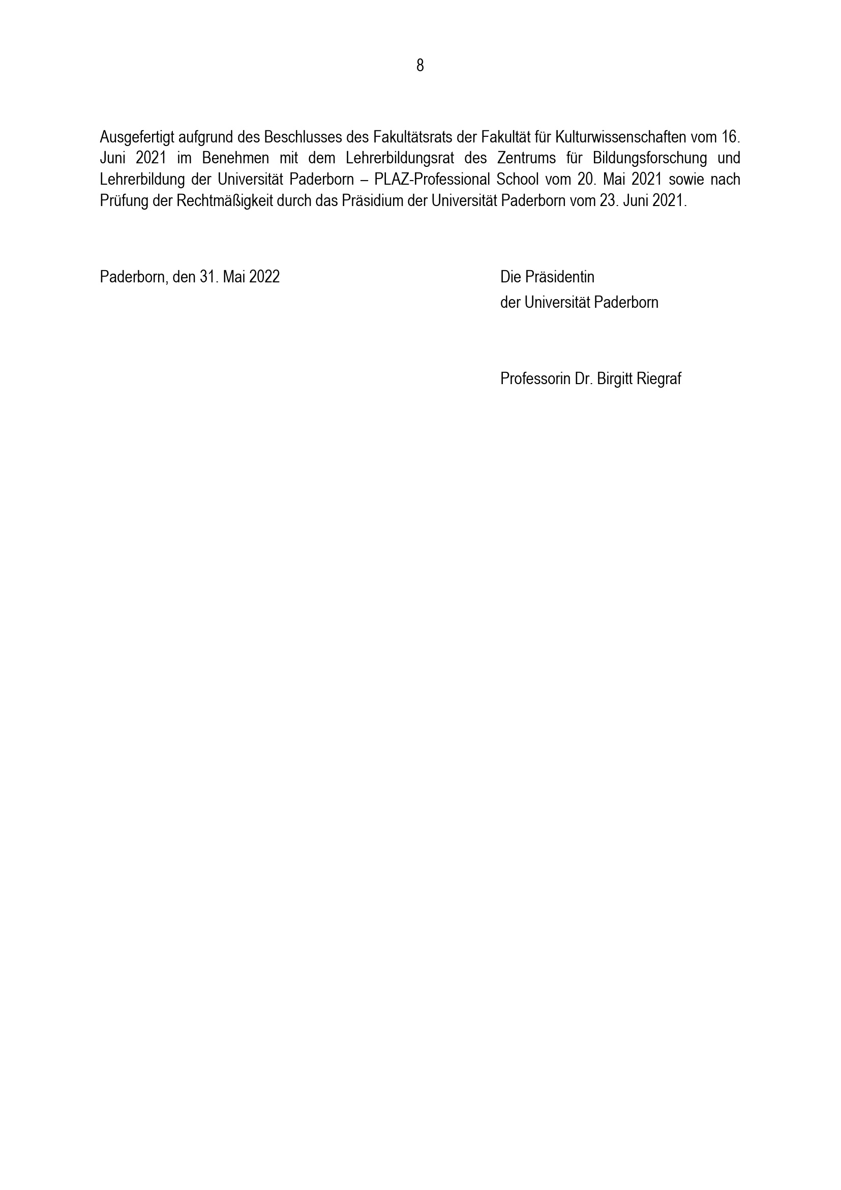 Besondere Bestimmungen der Prüfungsordnung für den Masterstudiengang Lehramt an Berufskollegs mit dem Unterrichtsfach Kunst an der Universität Paderborn : vom 31. Mai 2022