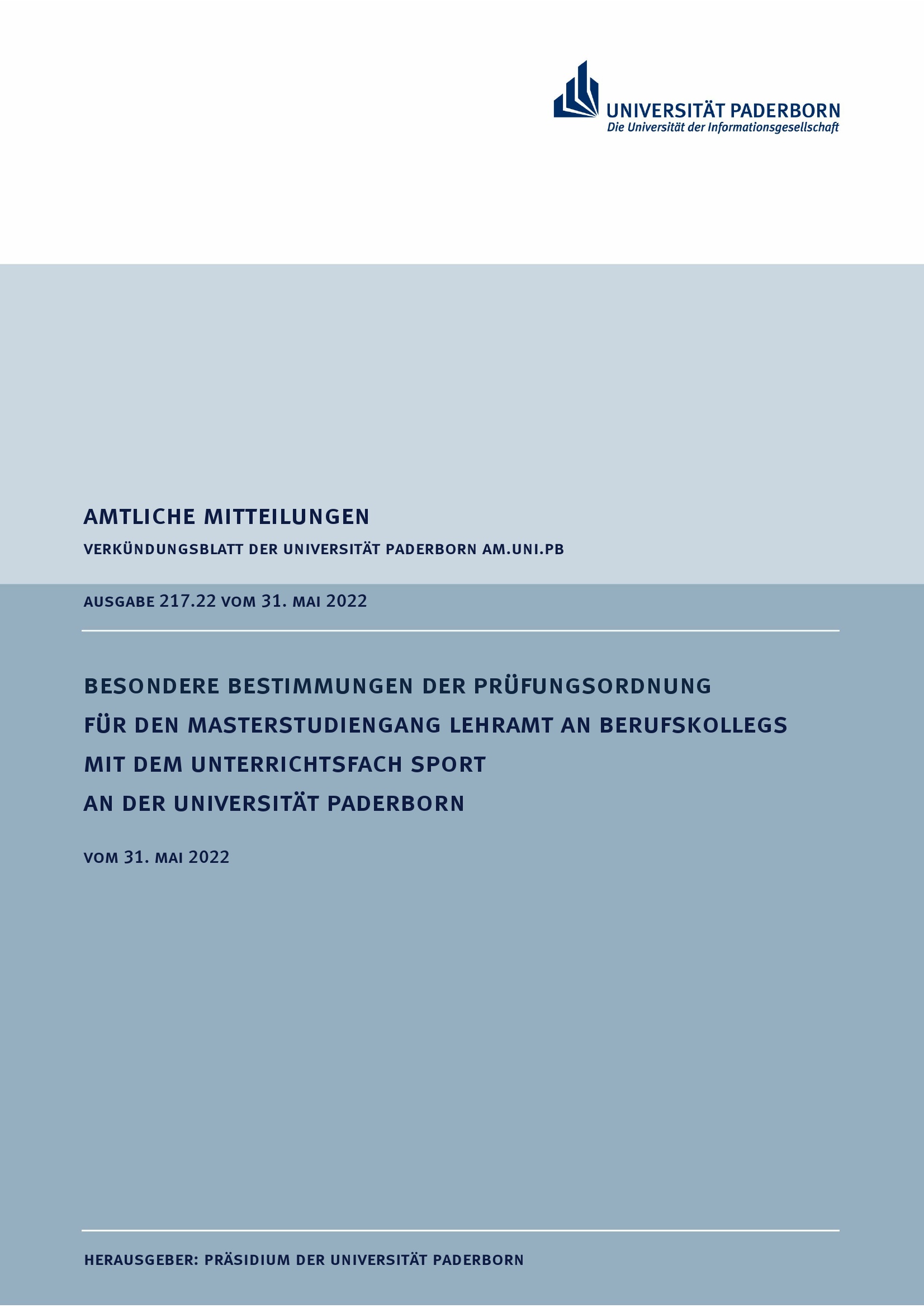 Besondere Bestimmungen der Prüfungsordnung für den Masterstudiengang Lehramt an Berufskollegs mit dem Unterrichtsfach Sport an der Universität Paderborn : vom 31. Mai 2022