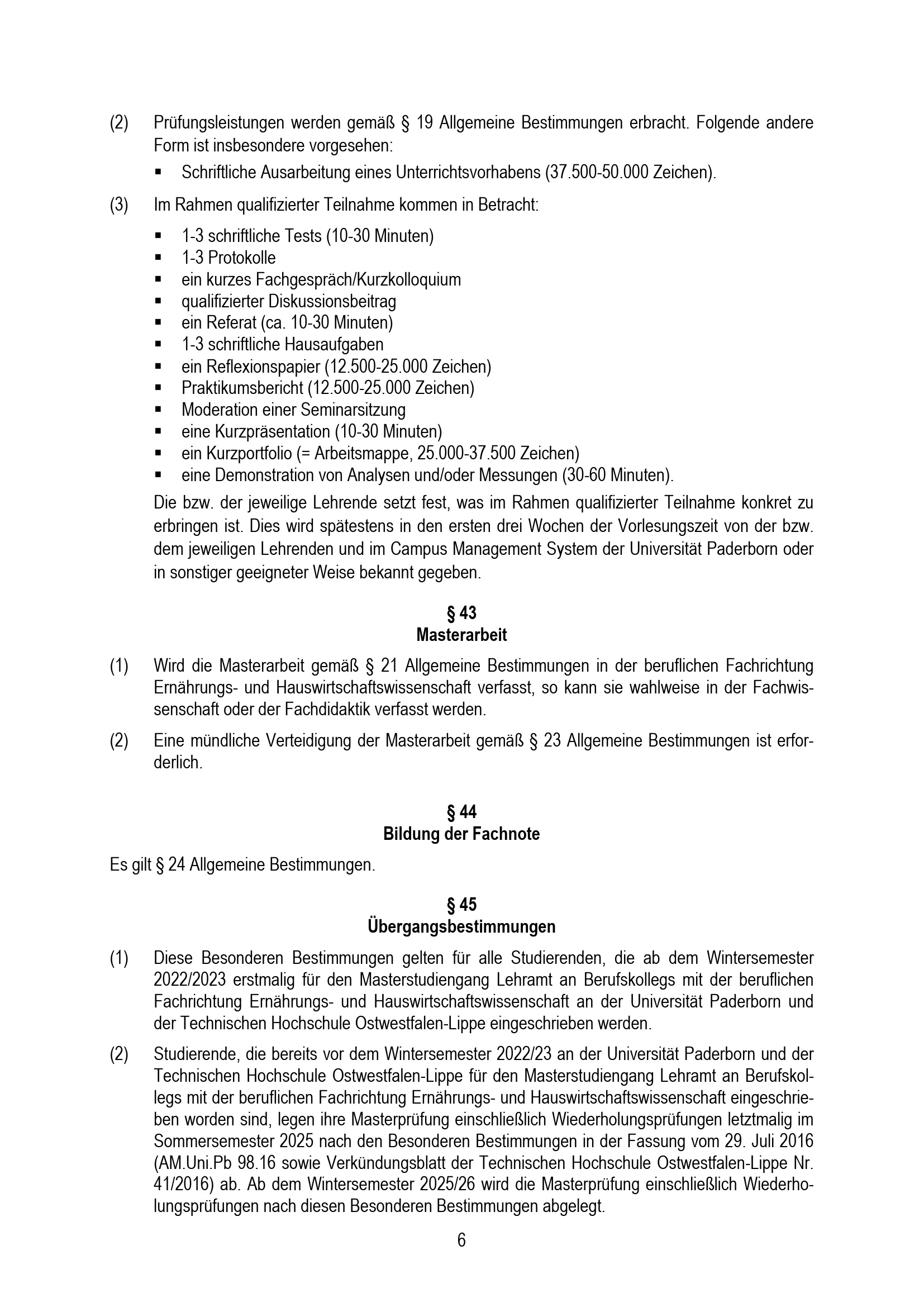 Besondere Bestimmungen der Prüfungsordnung für den Masterstudiengang Lehramt an Berufskollegs mit der beruflichen Fachrichtung Ernährungs- und Hauswirtschaftswissenschaft an der Universität Paderborn und der Technischen Hochschule Ostwestfalen-Lippe : vom 31. Mai 2022