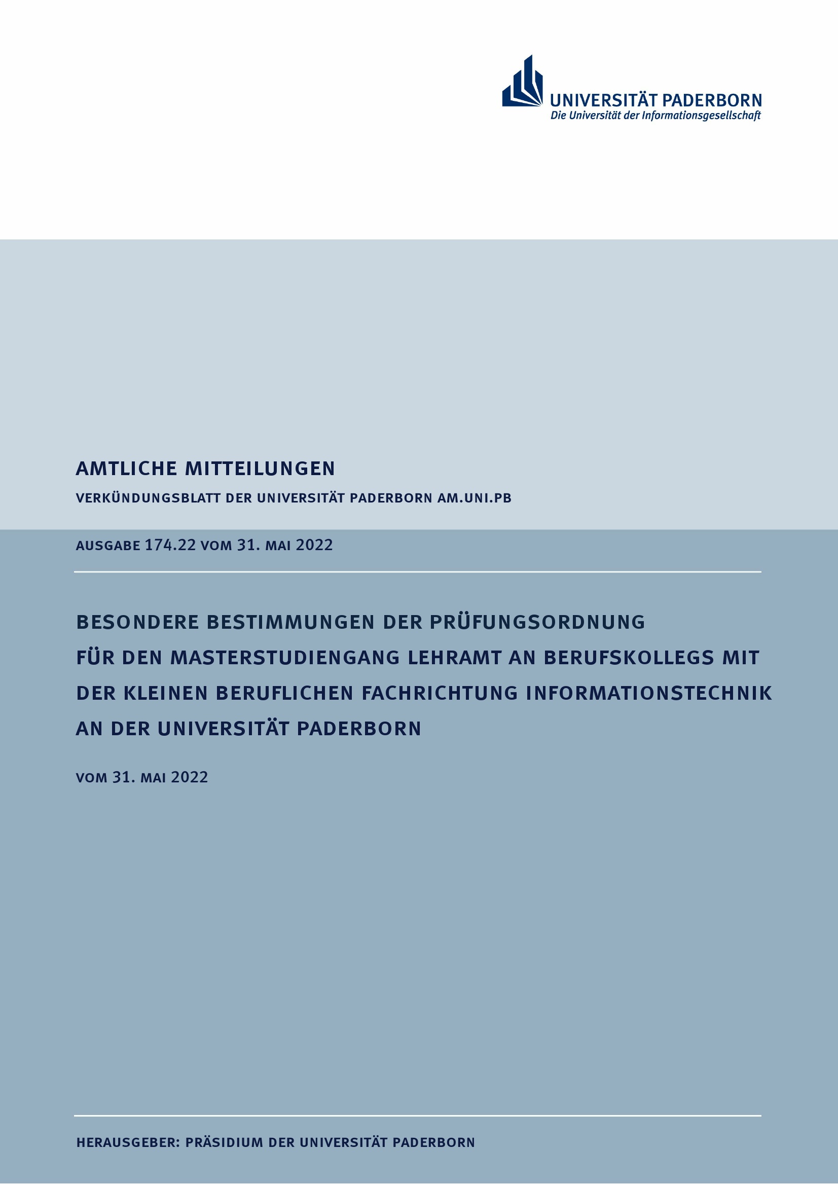 Besondere Bestimmungen der Prüfungsordnung für den Masterstudiengang Lehramt an Berufskollegs mit der Kleinen beruflichen Fachrichtung Informationstechnik an der Universität Paderborn : vom 31. Mai 2022