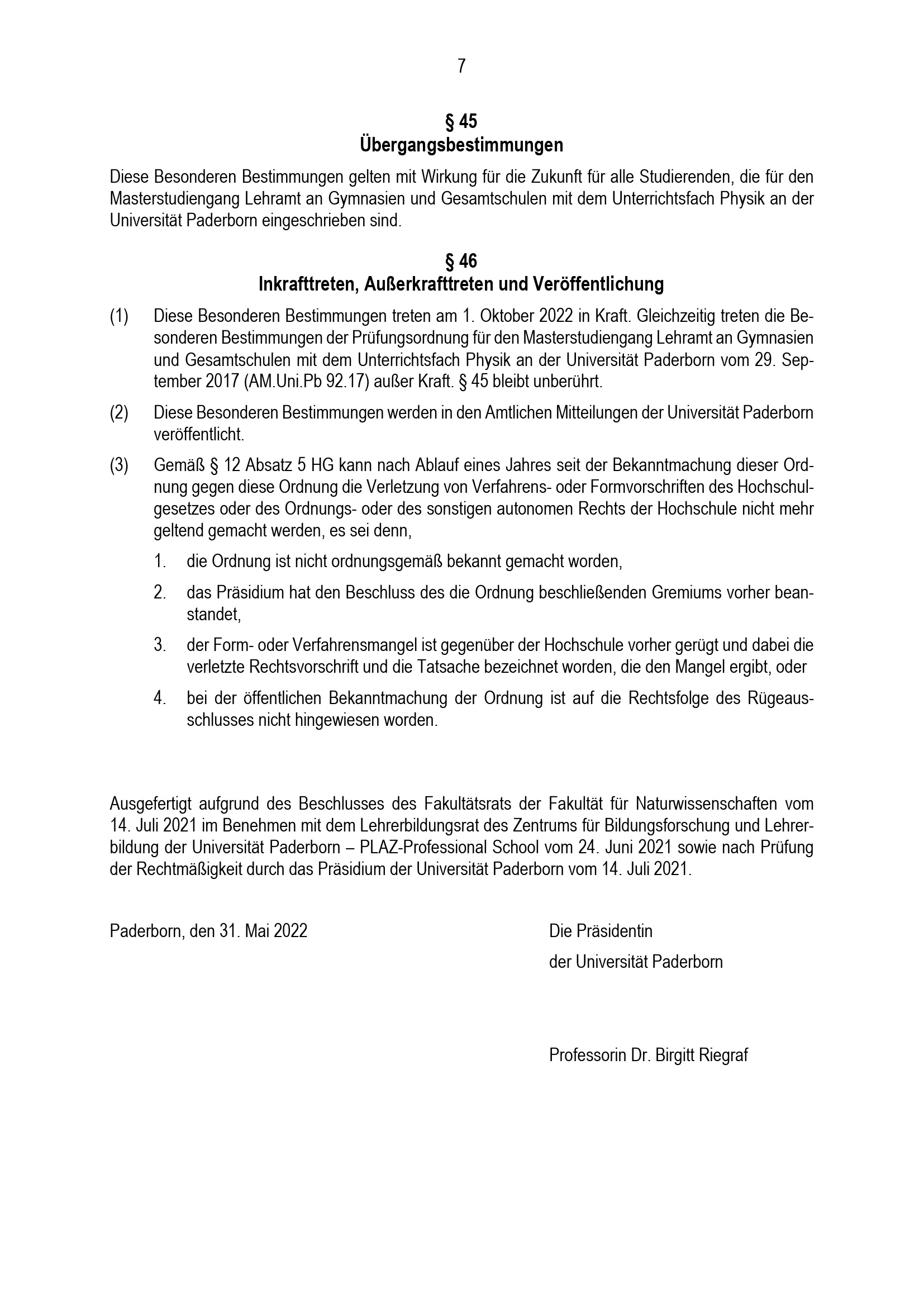 Besondere Bestimmungen der Prüfungsordnung für den Masterstudiengang Lehramt an Gymnasien und Gesamtschulen mit dem Unterrichtsfach Physik an der Universität Paderborn : vom 31. Mai 2022