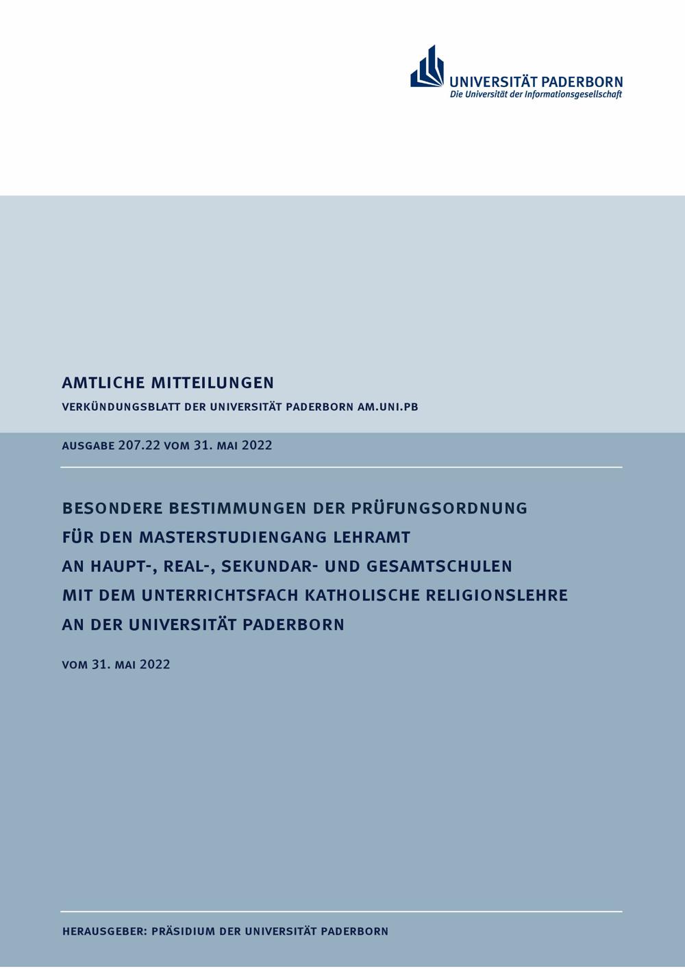Besondere Bestimmungen der Prüfungsordnung für den Masterstudiengang Lehramt an Haupt-, Real-, Sekundar- und Gesamtschulen mit dem Unterrichtsfach Katholische Religionslehre an der Universität Paderborn : vom 31. Mai 2022