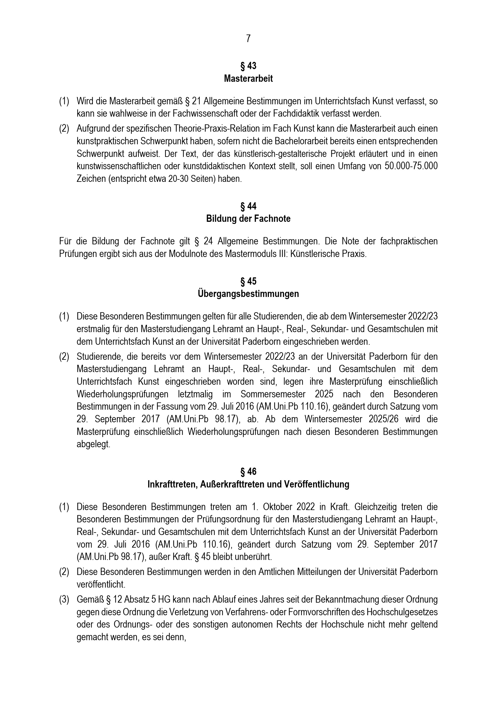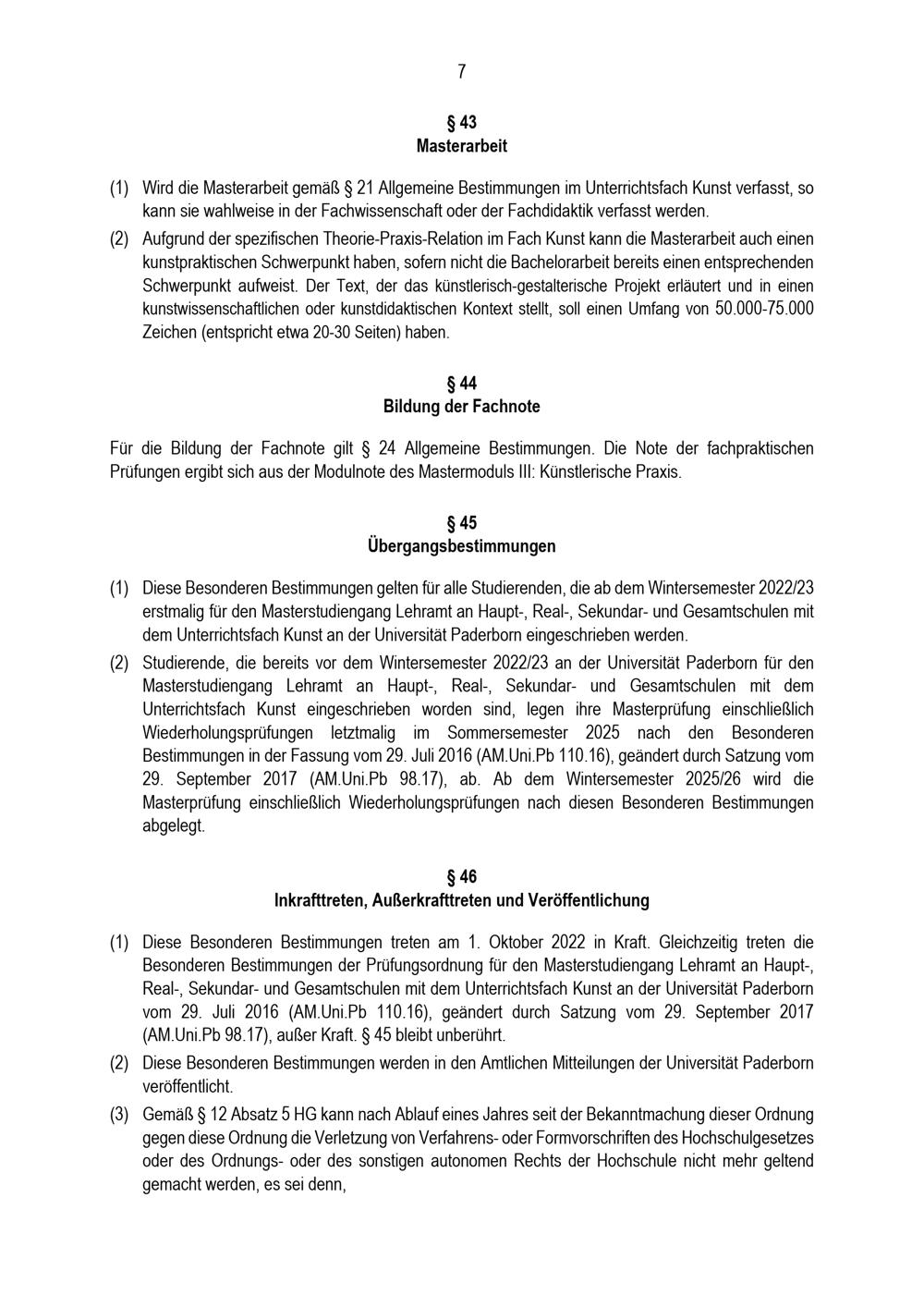 Besondere Bestimmungen der Prüfungsordnung für den Masterstudiengang Lehramt an Haupt-, Real-, Sekundar- und Gesamtschulen mit dem Unterrichtsfach Kunst an der Universität Paderborn : vom 31. Mai 2022
