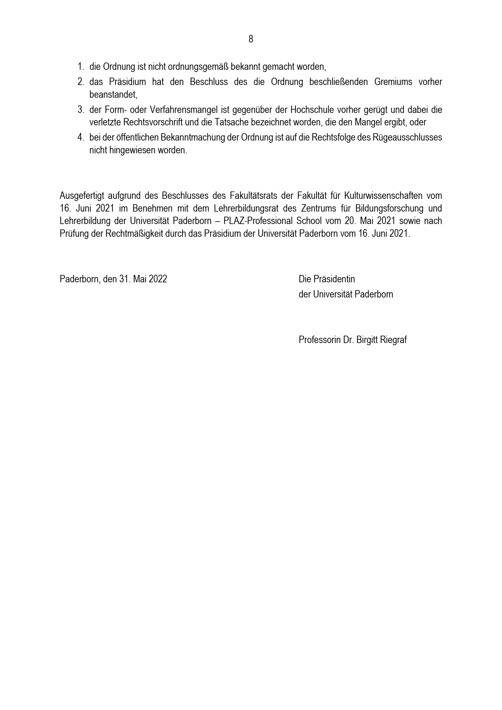 Besondere Bestimmungen der Prüfungsordnung für den Masterstudiengang Lehramt an Haupt-, Real-, Sekundar- und Gesamtschulen mit dem Unterrichtsfach Kunst an der Universität Paderborn : vom 31. Mai 2022