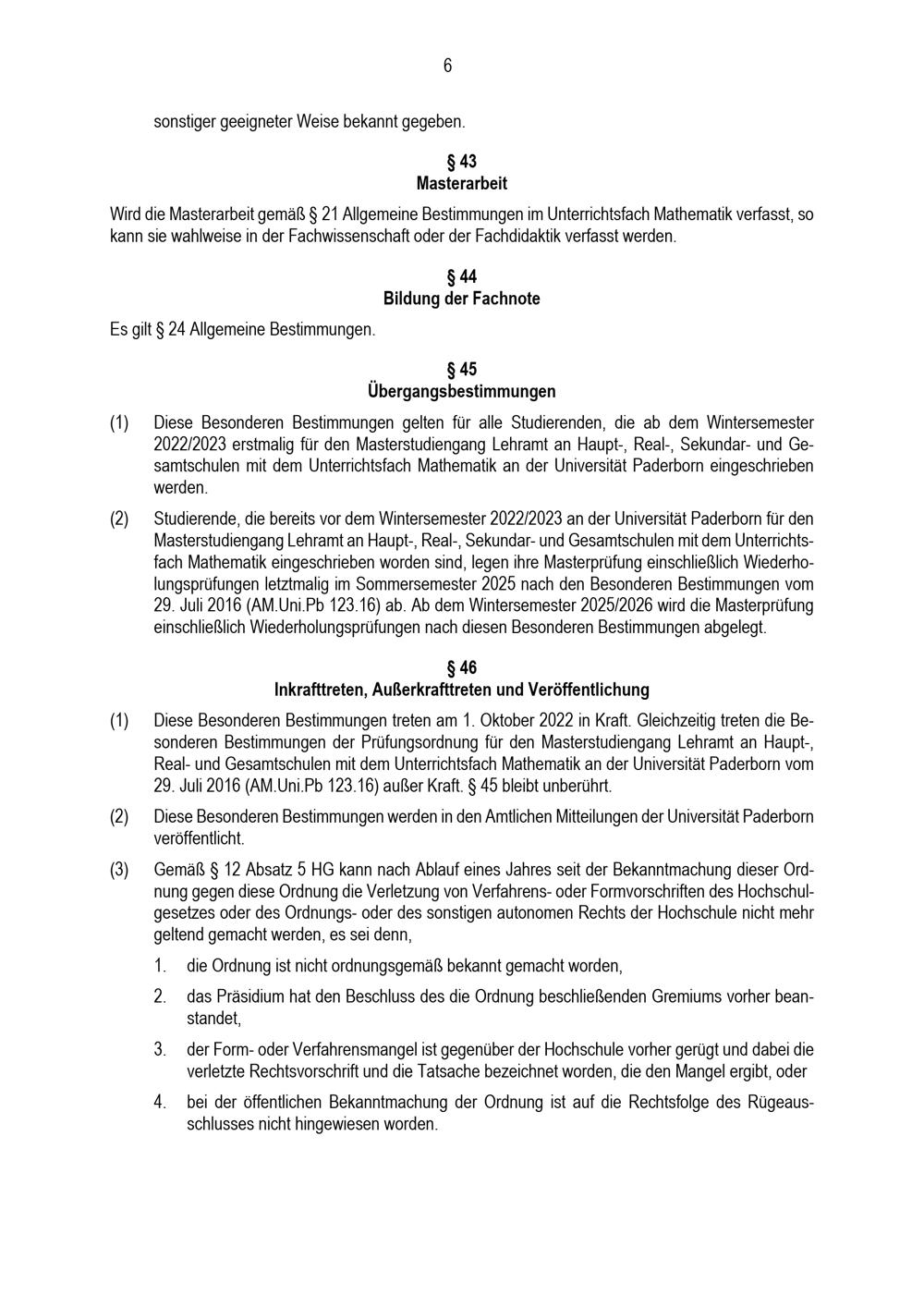Besondere Bestimmungen der Prüfungsordnung für den Masterstudiengang Lehramt an Haupt-, Real-, Sekundar- und Gesamtschulen mit dem Unterrichtsfach Mathematik an der Universität Paderborn : vom 31. Mai 2022