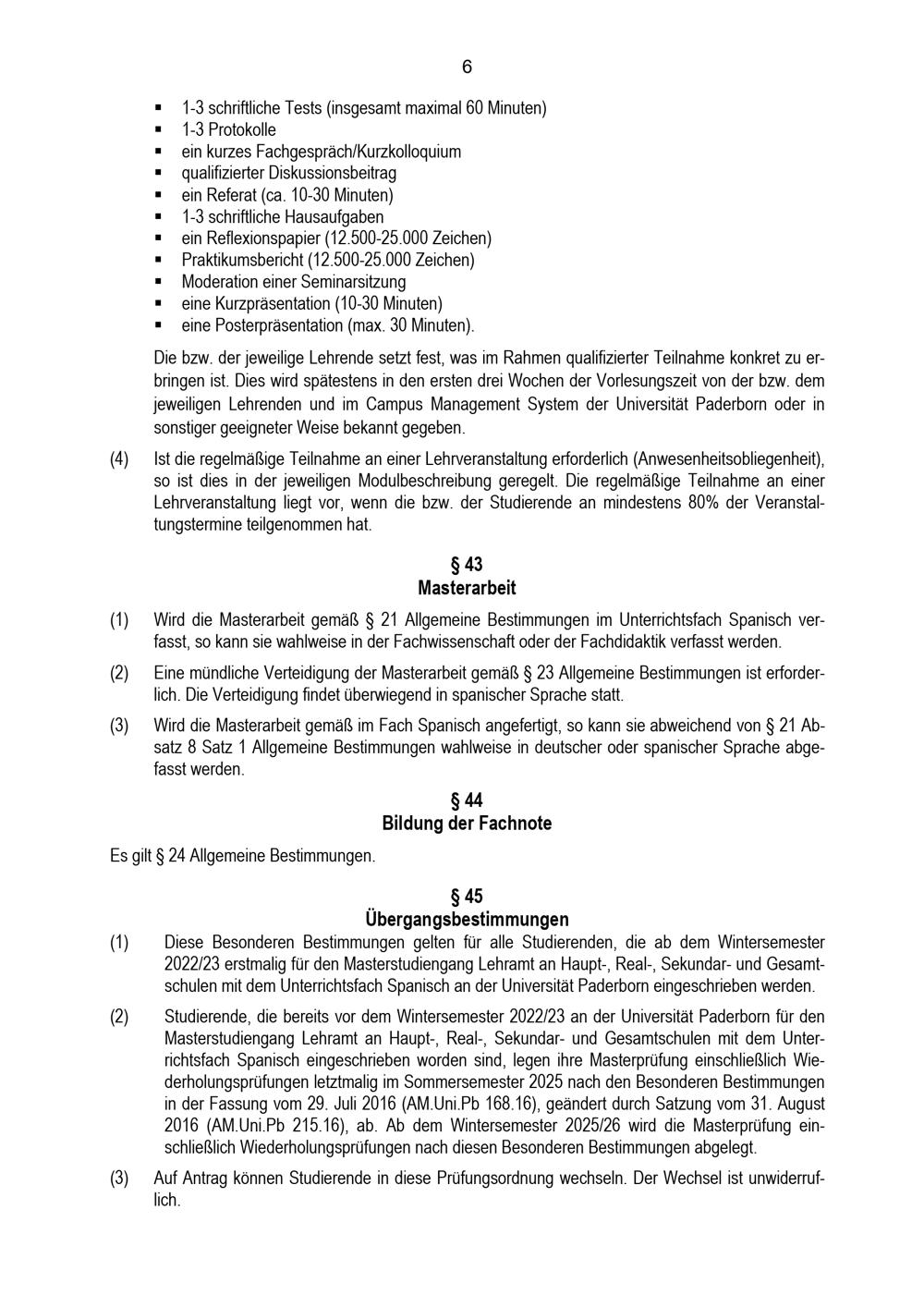 Besondere Bestimmungen der Prüfungsordnung für den Masterstudiengang Lehramt an Haupt-, Real-, Sekundar- und Gesamtschulen mit dem Unterrichtsfach Spanisch an der Universität Paderborn : vom 31. Mai 2022