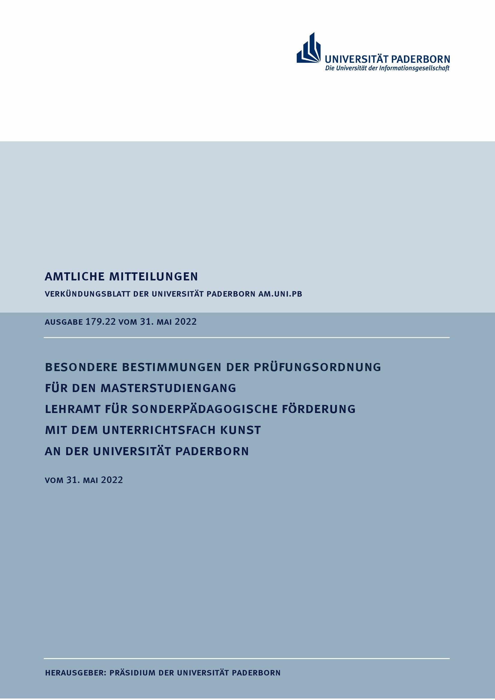 Besondere Bestimmungen der Prüfungsordnung für den Masterstudiengang Lehramt für sonderpädagogische Förderung mit dem Unterrichtsfach Kunst an der Universität Paderborn : vom 31. Mai 2022