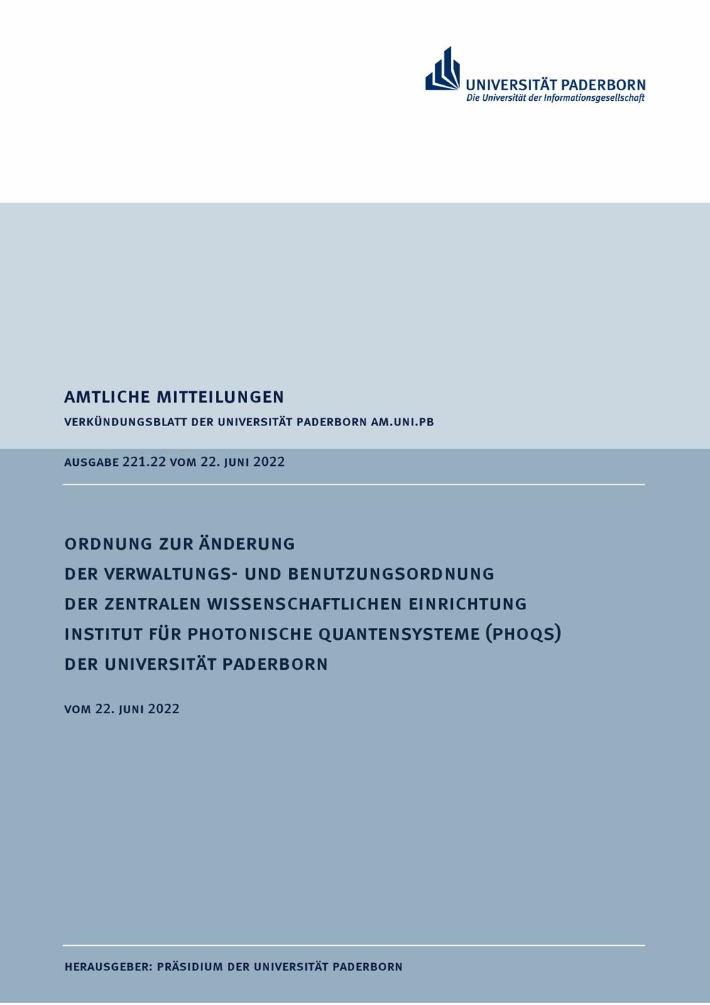 Ordnung zur Änderung der Verwaltungs- und Benutzungsordnung der zentralen wissenschaftlichen Einrichtung Institut für Photonische Quantensysteme (PhoQS) der Universität Paderborn : vom 22. Juni 2022
