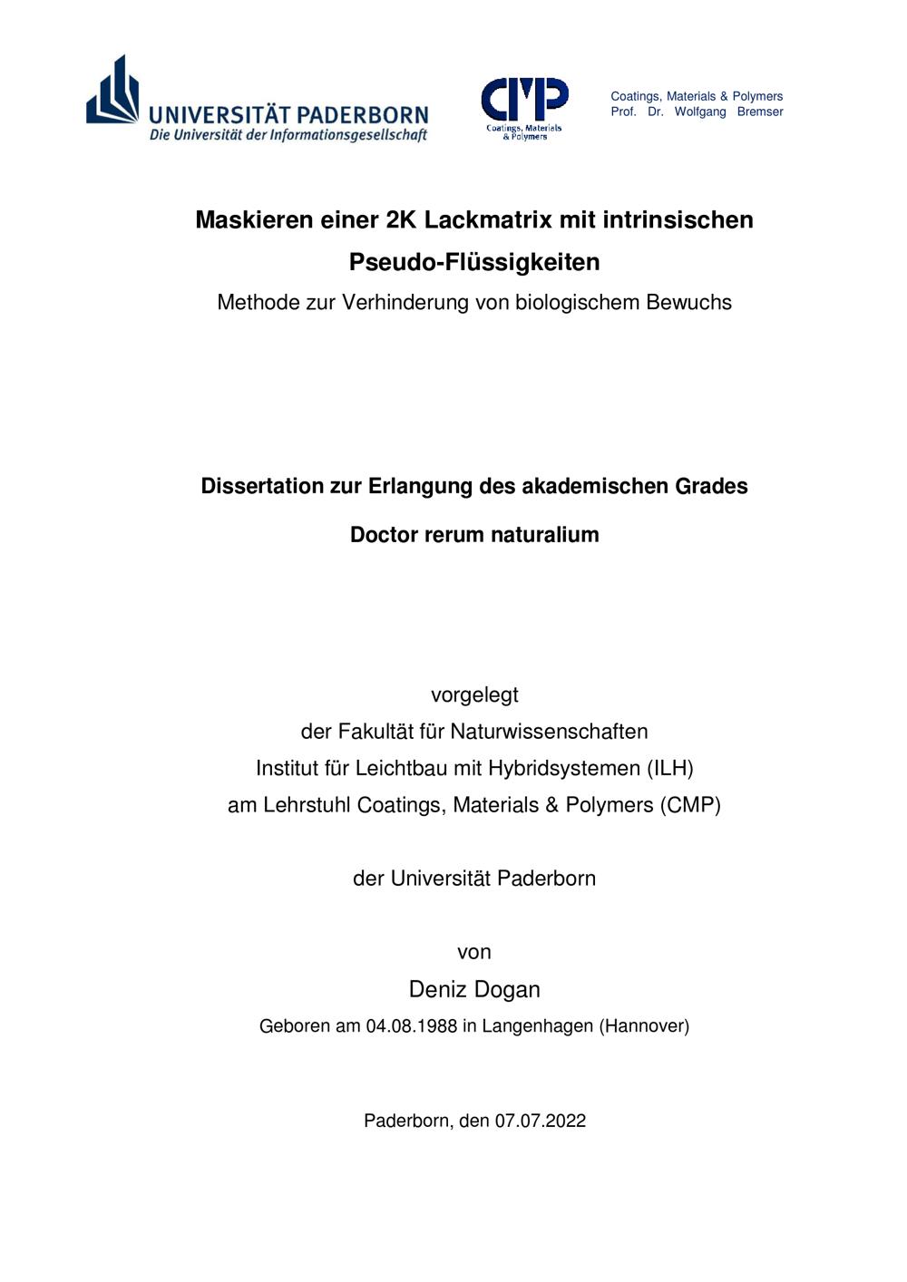 Maskieren einer 2K Lackmatrix mit intrinsischen Pseudo-Flüssigkeiten : Methode zur Verhinderung von biologischem Bewuchs / von Deniz Dogan ; [Vorsitzender der Prüfungskommission: Prof. Dr. Matthias Bauer, Hauptgutachter: Prof. Dr. Wolfgang Bremser, Gutachter: Prof. Dr. Hans-Joachim Warnecke, Drittprüfer: Priv.-Doz. Dr. Hans Egold]