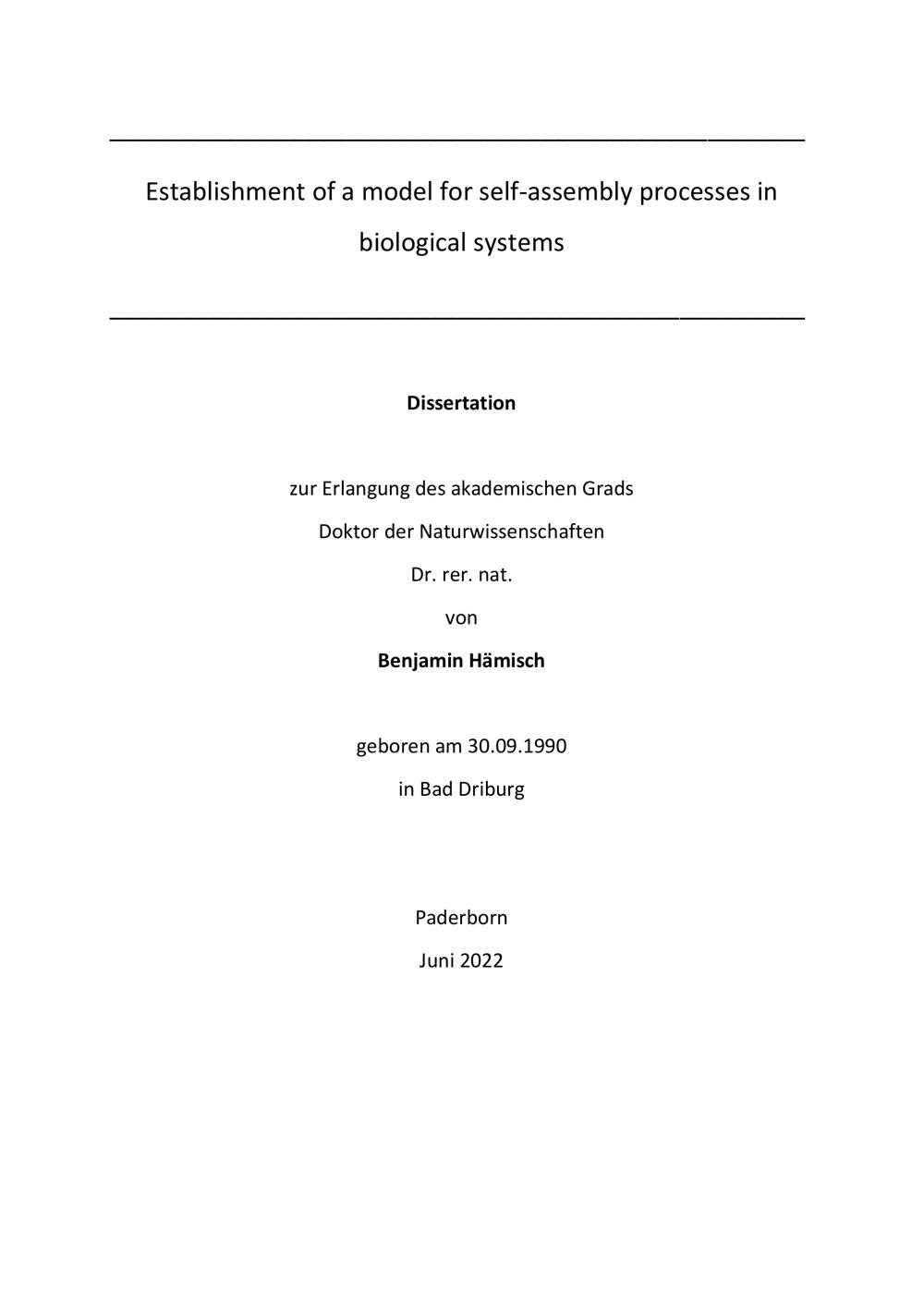 Establishment of a model for self-assembly processes in biological systems / von Benjamin Hämisch ; [Prof. Dr. Klaus Huber: Erstgutachter, Prof. Dr. Simon Ebbinghaus, Prof. Dr. Thomas Kühne: Zweitgutachter]