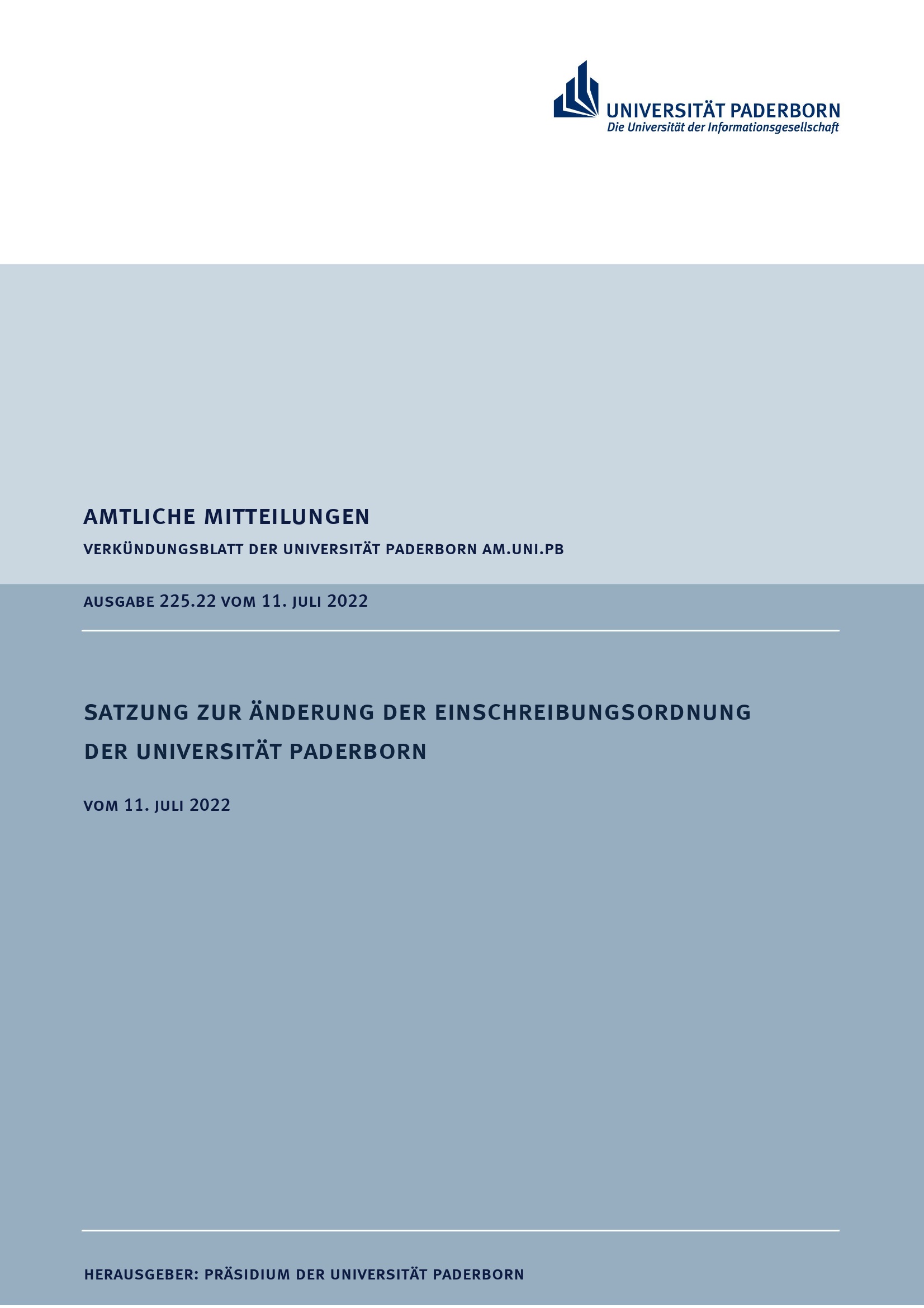 Satzung zur Änderung der Einschreibungsordnung der Universität Paderborn : vom 11. Juli 2022
