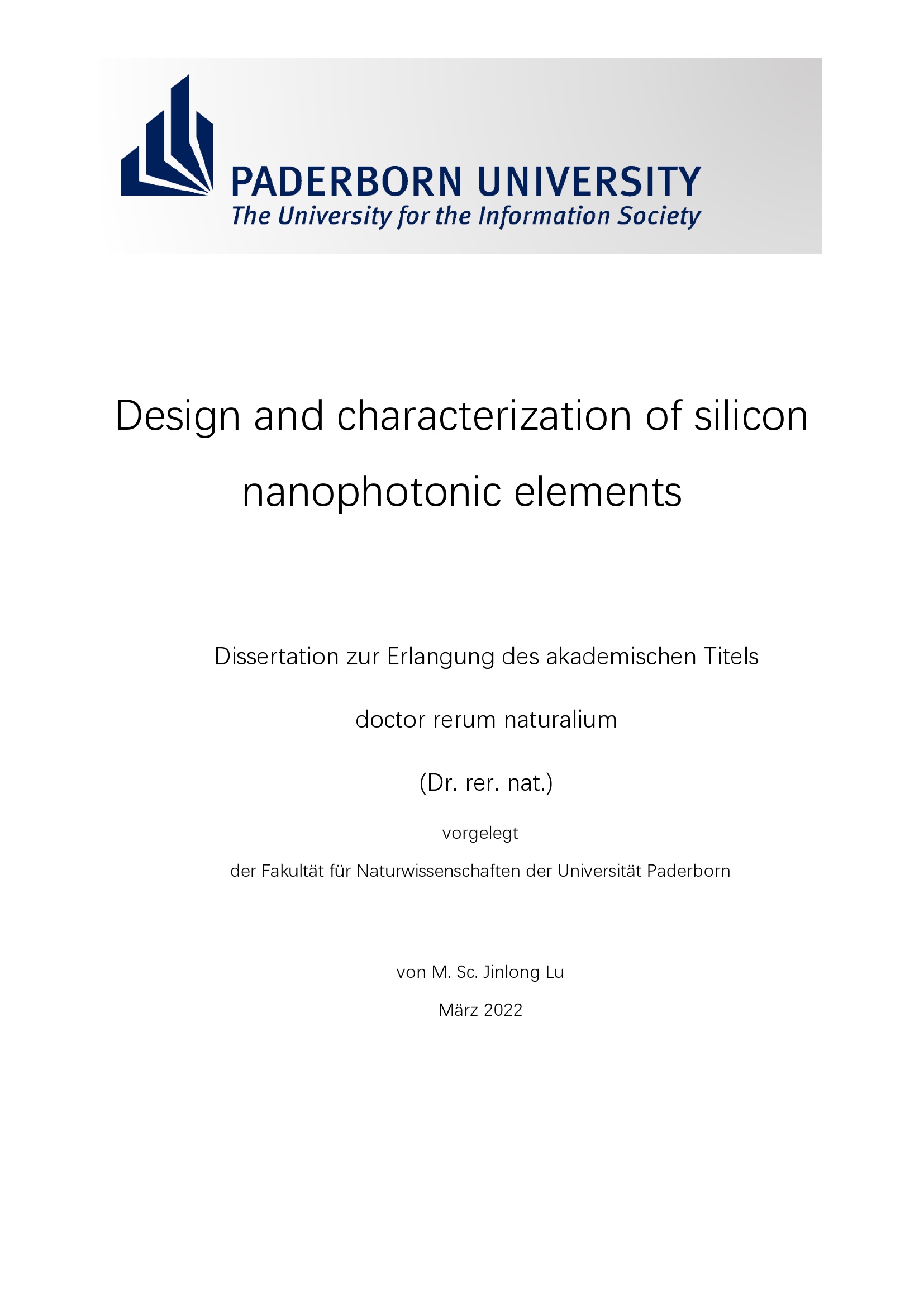 Design and characterization of silicon nanophotonic elements / von M. Sc. Jinlong Lu