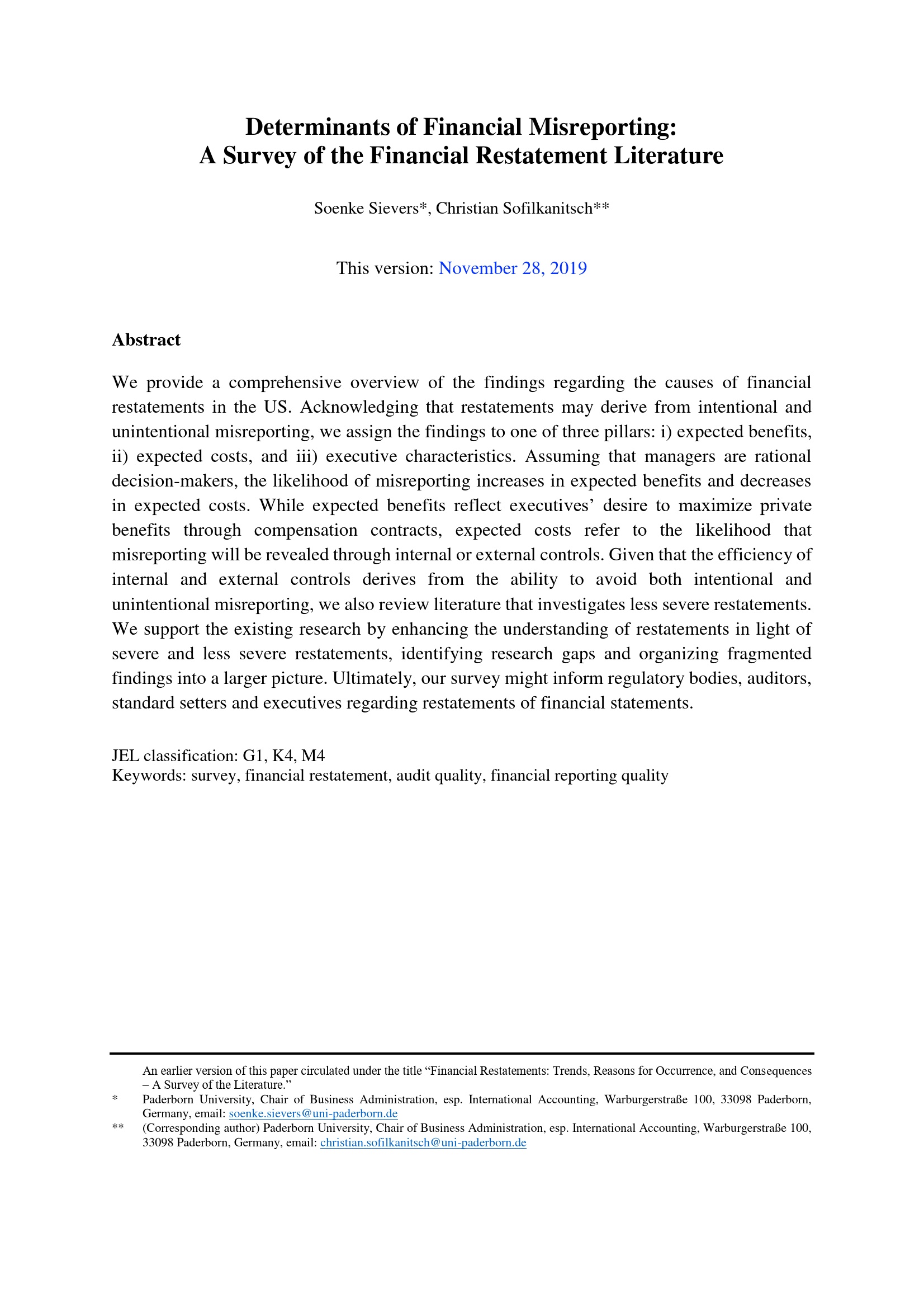 Determinants of financial misreporting : a survey of the financial restatement literature / Sönke Sievers, Christian Sofilkanitsch