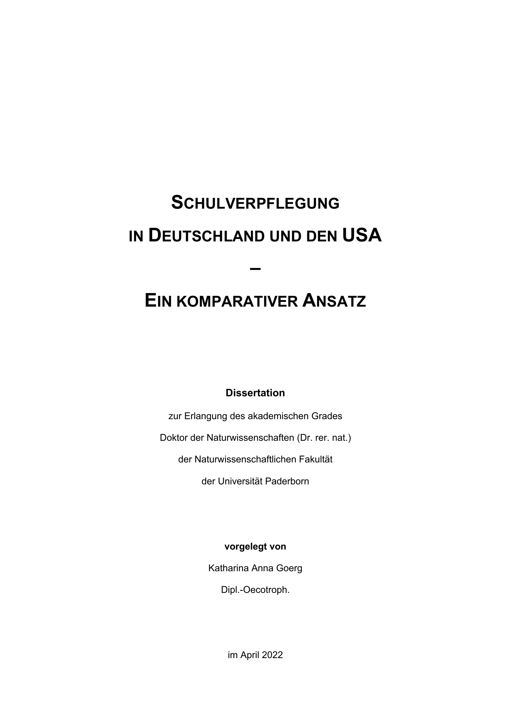 Schulverpflegung in Deutschland und den USA - ein komparativer Ansatz / vorgelegt von Katharina Anna Goerg, Dipl.-Oecotroph. ; [Erster Gutacher: Prof. Dr. Helmut Heseker, Zweite Gutachterin: Prof. Dr. Christel Rademacher]