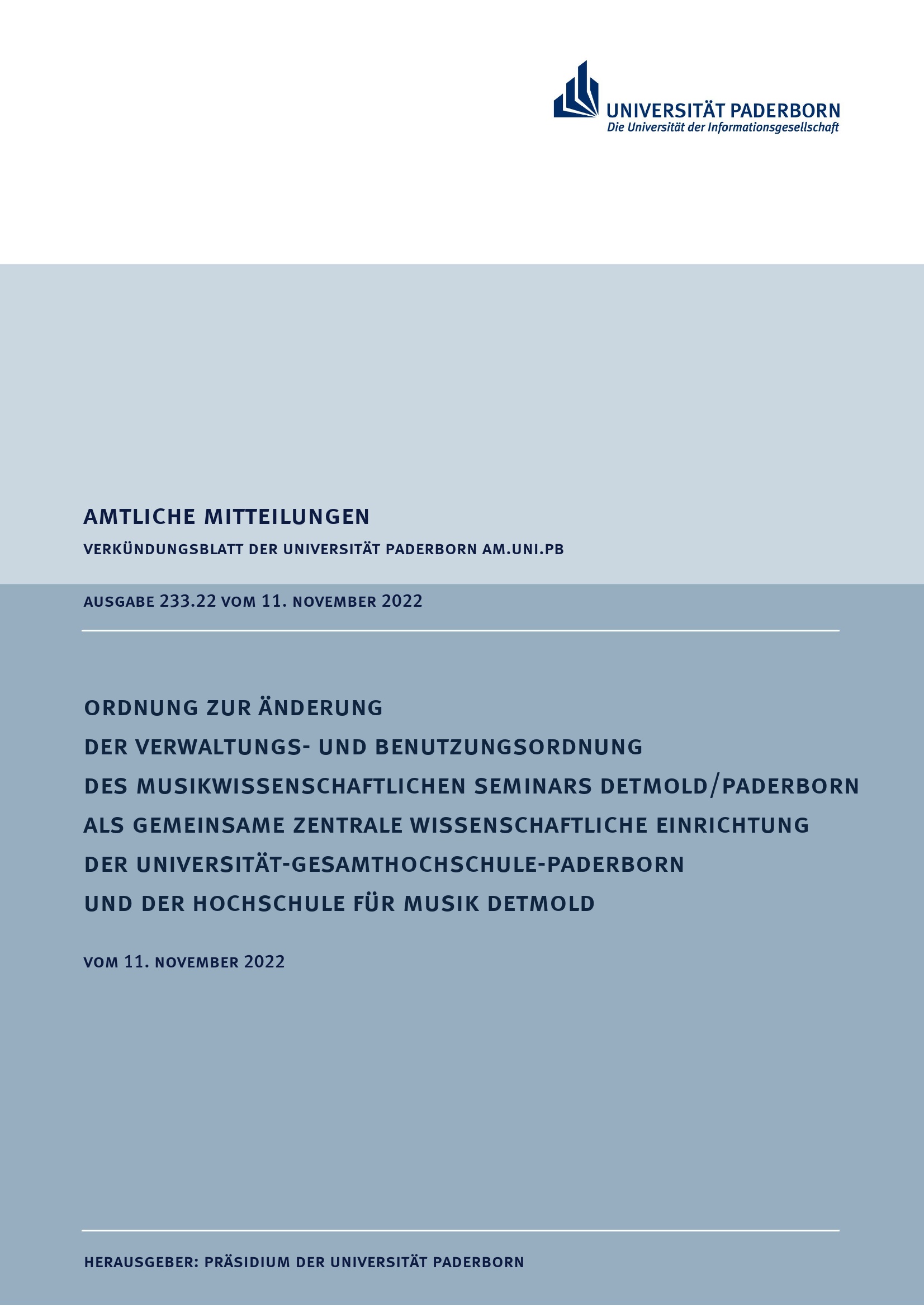 Ordnung zur Änderung der Verwaltungs- und Benutzungsordnung des Musikwissenschaftlichen Seminars Detmold/Paderborn als gemeinsame zentrale wissenschaftliche Einrichtung der Universität- Gesamthochschule-Paderborn und der Hochschule für Musik Detmold : vom 11. November 2022