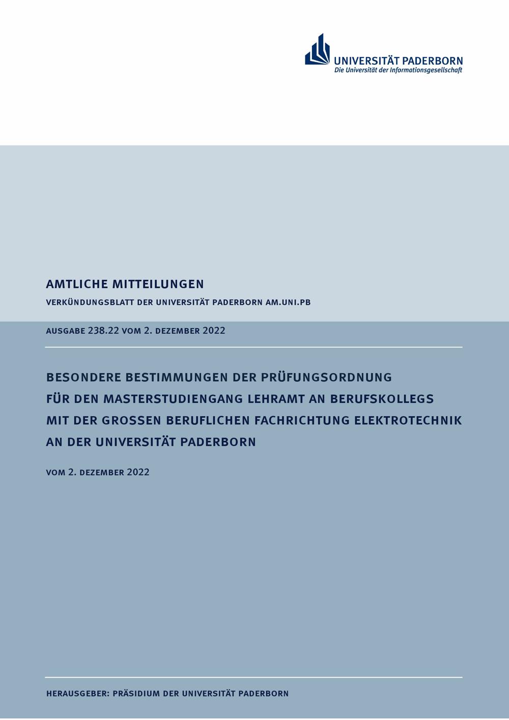 Besondere Bestimmungen der Prüfungsordnung für den Masterstudiengang Lehramt an Berufskollegs mit der Großen beruflichen Fachrichtung Elektrotechnik an der Universität Paderborn : vom 2. Dezember 2022