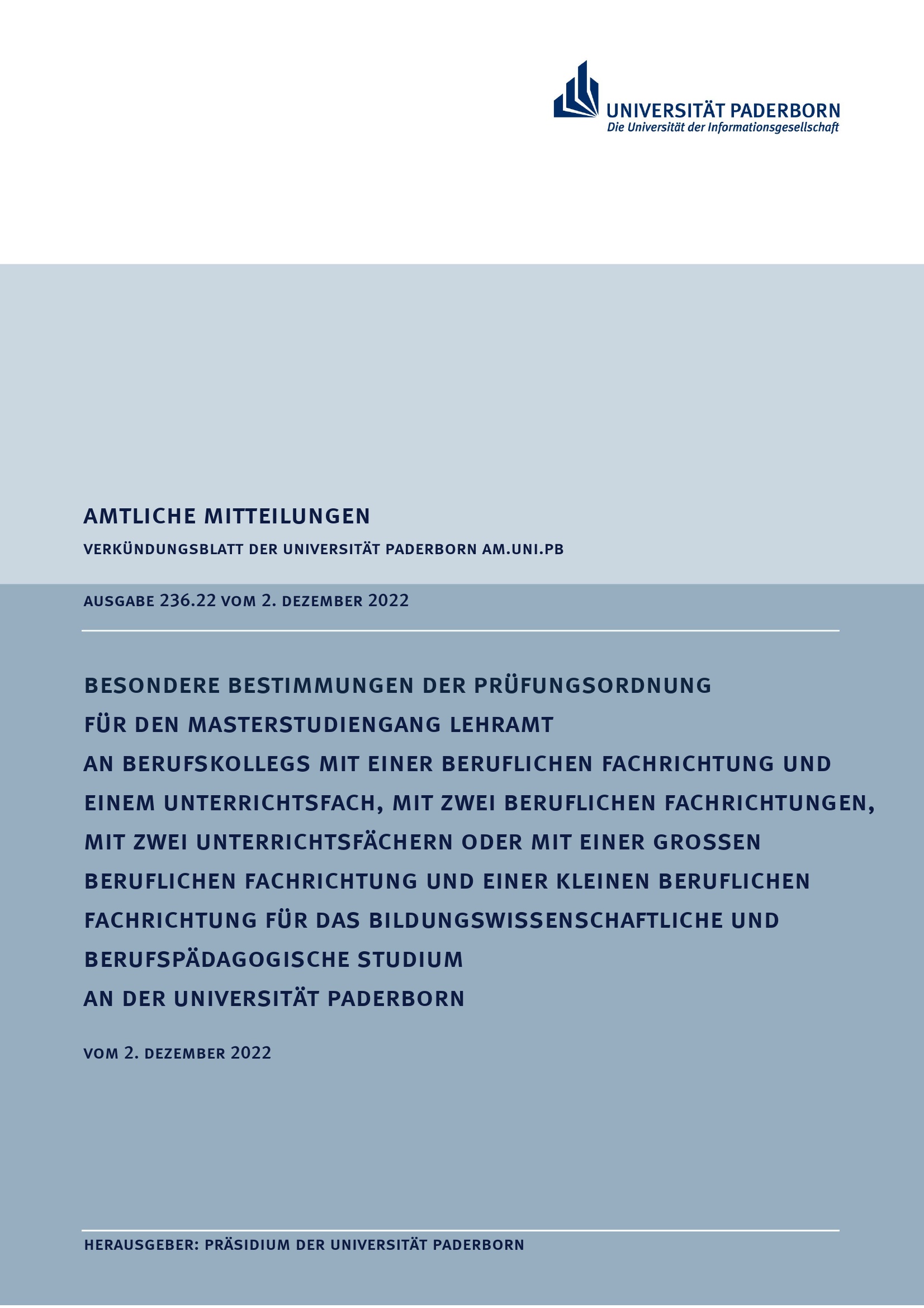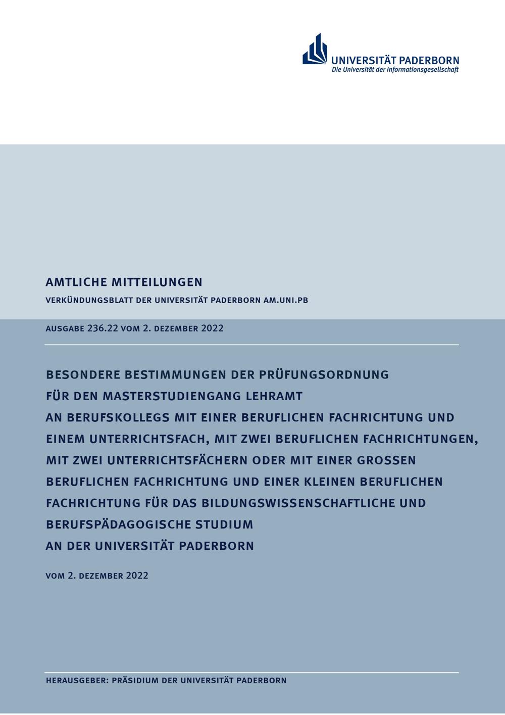 Besondere Bestimmungen der Prüfungsordnung für den Masterstudiengang Lehramt an Berufskollegs mit einer beruflichen Fachrichtung und einem Unterrichtsfach, mit zwei beruflichen Fachrichtungen, mit zwei Unterrichtsfächern oder mit einer Großen beruflichen Fachrichtung und einer Kleinen beruflichen Fachrichtung : vom 2. Dezember 2022