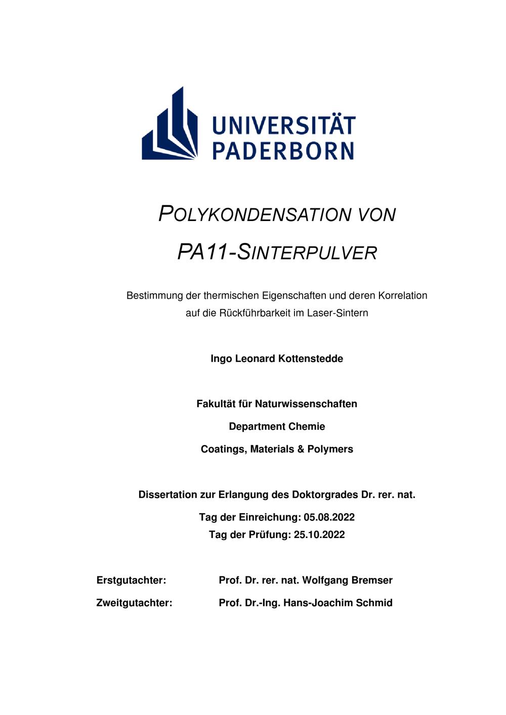 Polykondensation von PA11-Sinterpulver : Bestimmung der thermischen Eigenschaften und deren Korrelation auf die Rückführbarkeit im Laser-Sintern / Ingo Leonard Kottenstedde, Erstgutachter: Prof. Dr. rer. nat. Wolfgang Bremser, Zweitgutachter: Prof. Dr.-Ing. Hans-Joachim Schmid
