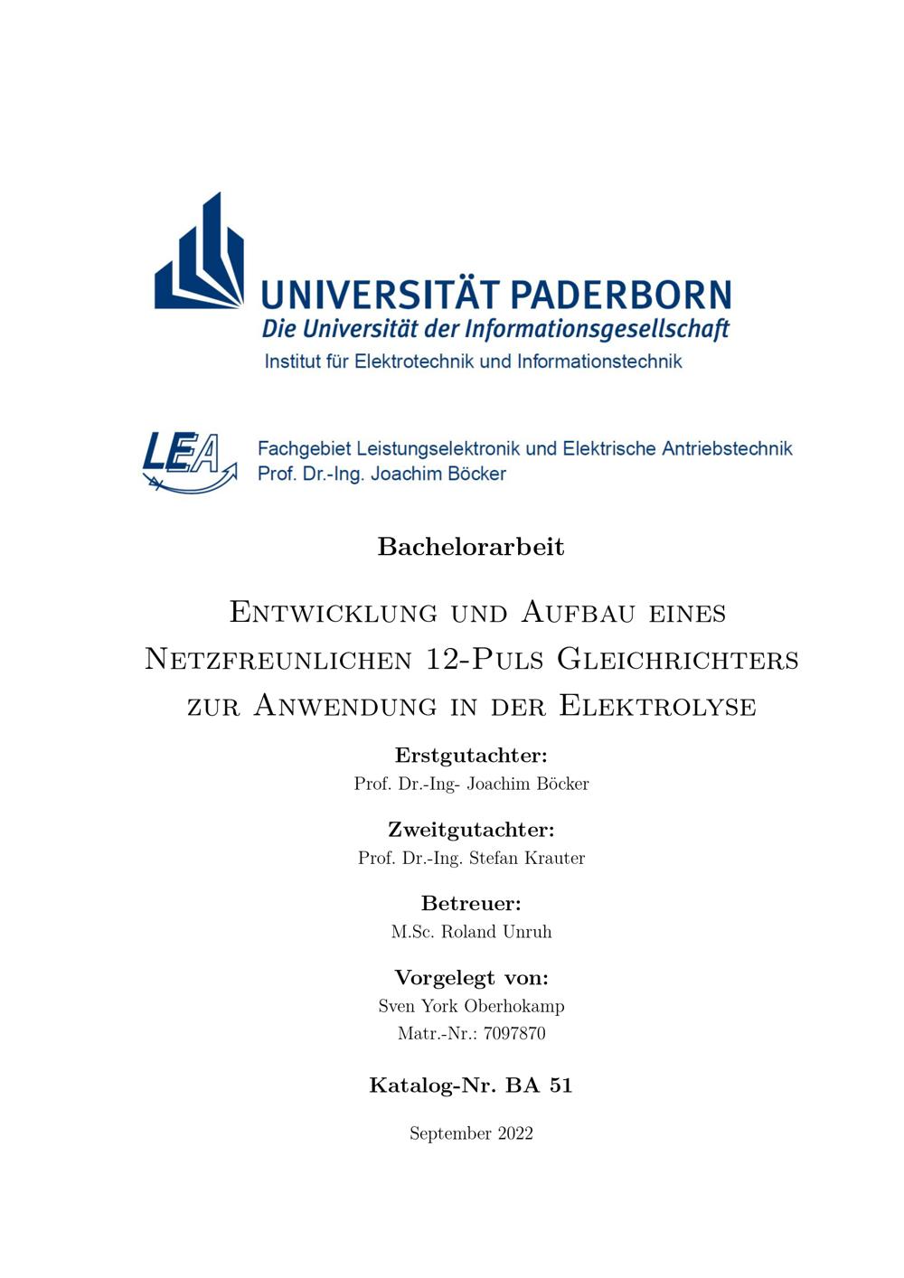 Entwicklung und Aufbau eines netzfreundlichen 12-Puls Gleichrichters zur Anwendung in der Elektrolyse / vorgelegt von Sven York Oberhokamp ; Erstgutachter: Prof. Dr.-Ing- Joachim Böcker, Zweitgutachter: Prof. Dr.-Ing. Stefan Krauter, Betreuer: M.Sc. Roland Unruh