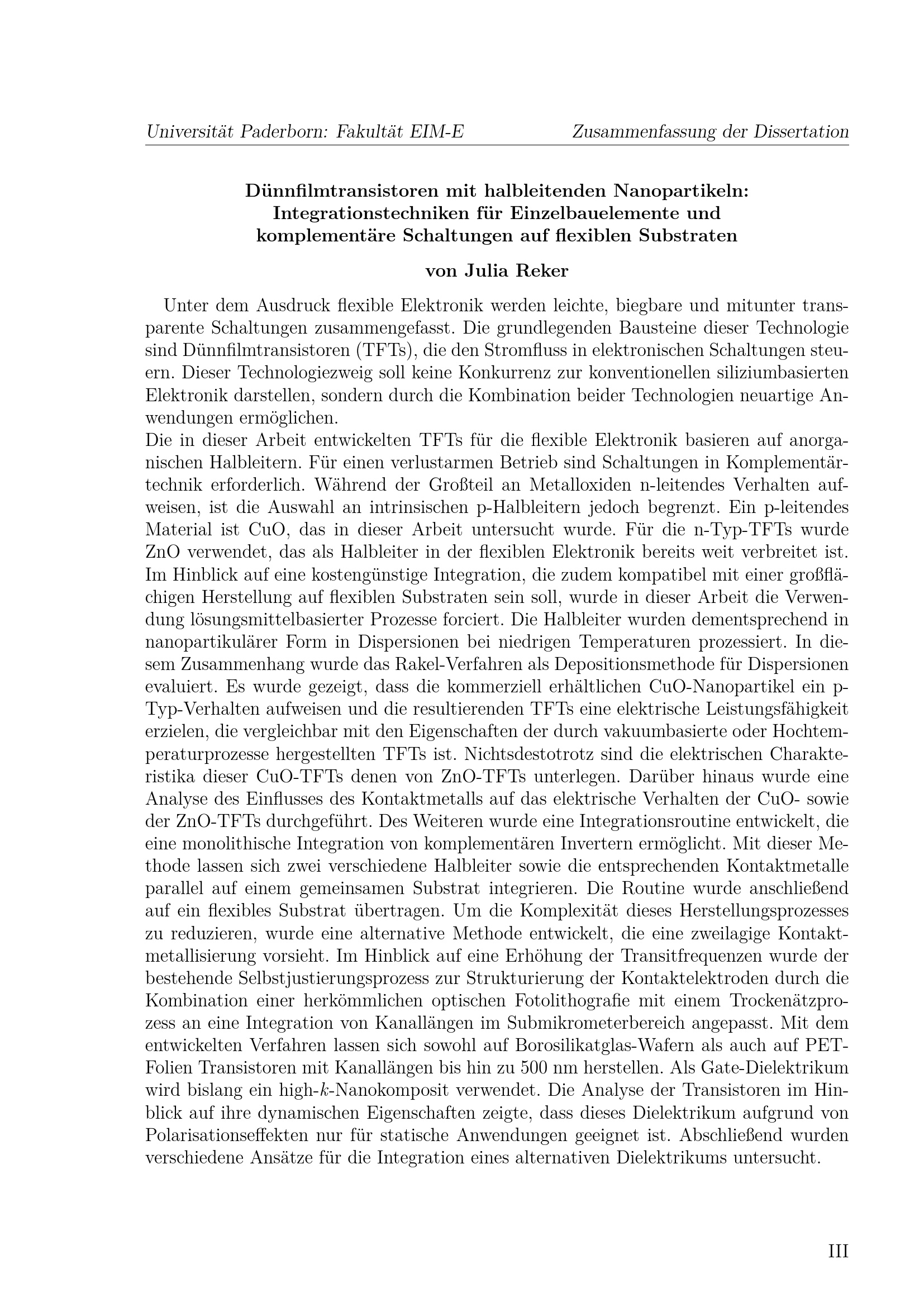 Dünnfilmtransistoren mit halbleitenden Nanopartikeln: Integrationstechniken für Einzelbauelemente und komplementäre Schaltungen auf flexiblen Substraten / von M. Sc. Julia Reker ; Erster Gutachter: Prof. Dr.-Ing. Ulrich Hilleringmann, Zweiter Gutachter: Prof. Dr. Trudi-Heleen Joubert