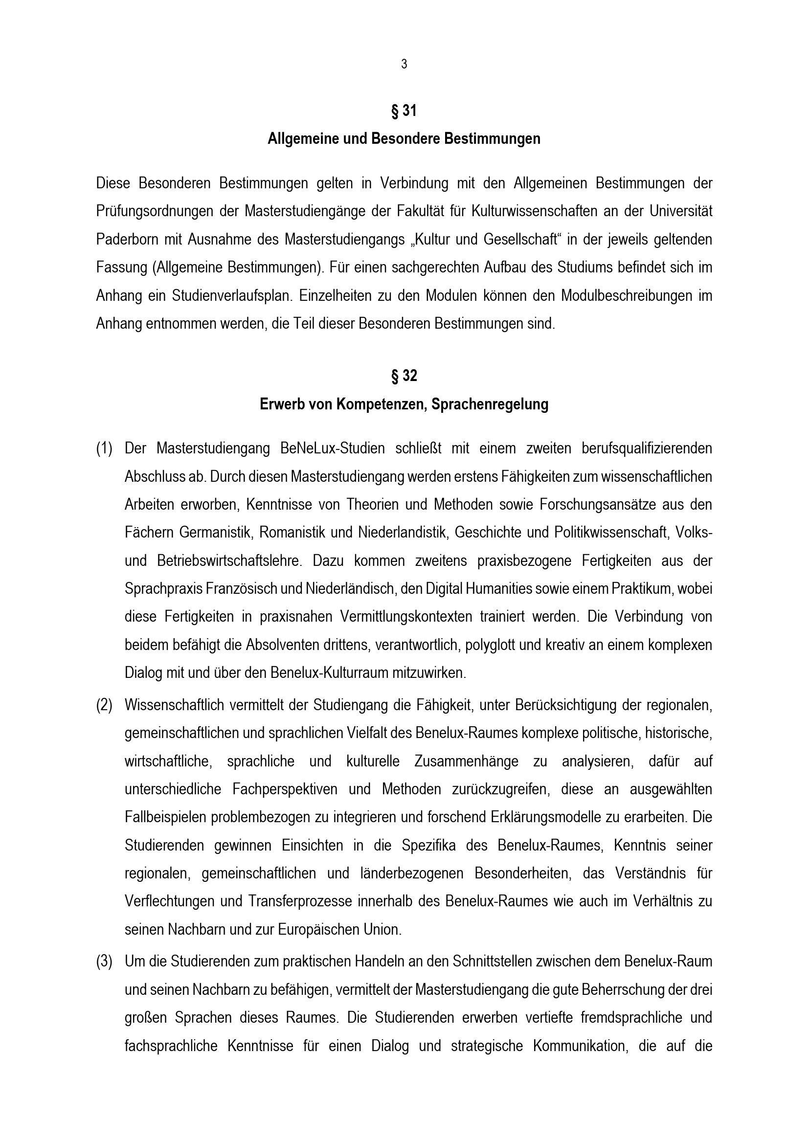 Besondere Bestimmungen der Prüfungsordnung für den Masterstudiengang BeNeLux-Studien der Fakultät für Kulturwissenschaften an der Universität Paderborn : vom 24. April 2023