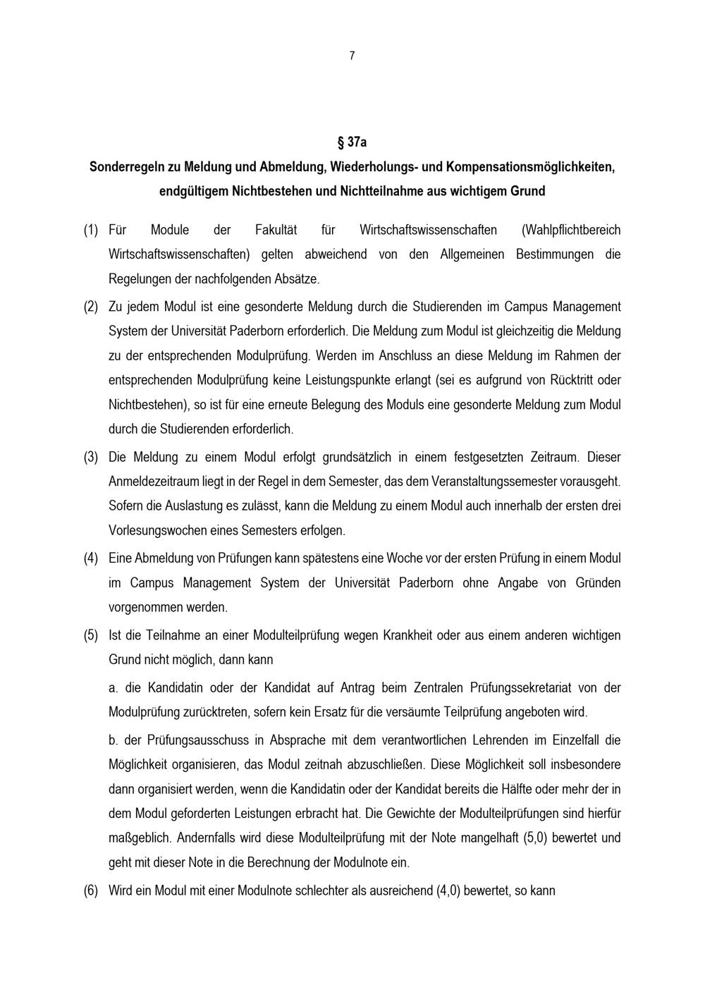 § 37a Sonderregeln zu Meldung und Abmeldung, Wiederholungs- und Kompensationsmöglichkeiten, endgültigem Nichtbestehen und Nichtteilnahme aus wichtigem Grund