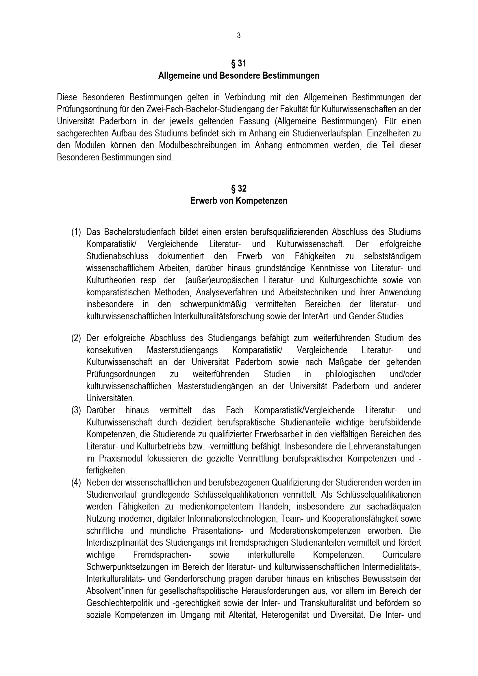 Besondere Bestimmungen der Prüfungsordnung für den Zwei-Fach-Bachelor-Studiengang der Fakultät für Kulturwissenschaften für das Fach Komparatistik : vom 31. Mai 2023 / Vergleichende Literatur- und Kulturwissenschaft an der Universität Paderborn